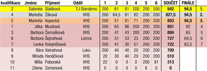 Nejdřív ale bylo ženské finále, kam postoupilo 7 ze zúčastněných. Cesta byla věru těžká – klasifikací tak 7b. Holky se praly statečně – z našich řad sem postoupily 4 gladiátorky ale na bednu se vešly jen dvě. Tři nejlepší tečovaly stejný chyt, a tak o pořadí rozhodla kvalifikace. Tedy třetí místo brala Maky Kopecká, druhá byla Markéta Žáková a 1. místo vybojovala Gabriela Sládková.