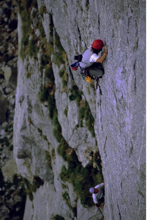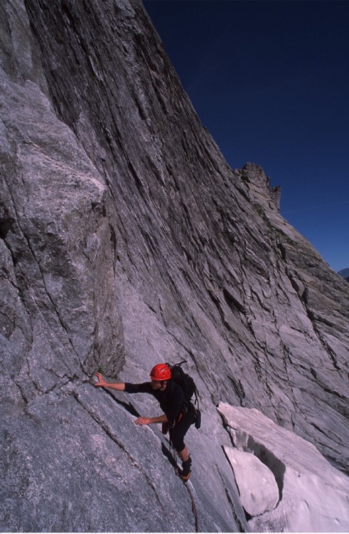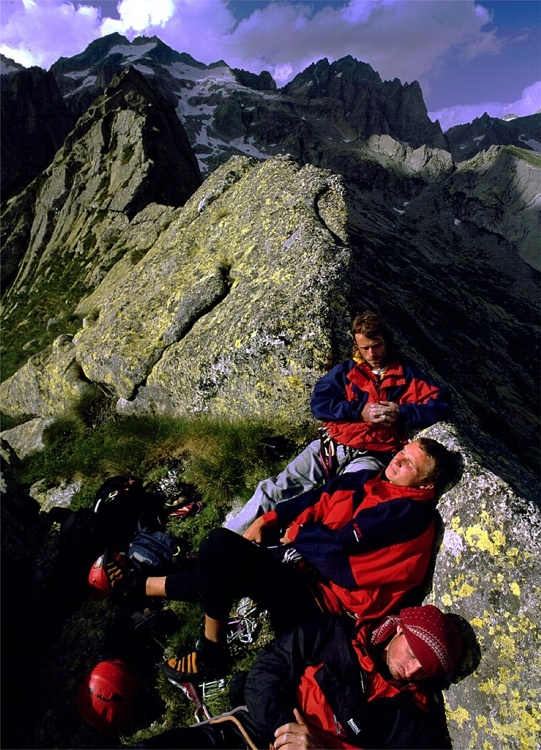 Utábořili jsme se na jedné z malých louček nad chatou, cca na půli cesty mezi sedlem a chatou. Naprosto neuvěřitelné počasí, kýčově modrá obloha bez jediného mraku, téměř žádný vítr. V neděli jsme lezli cesty Peter Pan (Dušín, Fejta) a Another day in Paradise (ostatní), v pondělí odpočinek a příprava na Anglickou cestu. V úterý cca ve tři v noci jsme vyrazili, abychom přešli ledovec ještě za tmy, to se podařilo až na poslední trhlinu téměř u stěny, která nebyla předchozí den ze sedla vidět. Chyběla odvaha a tak jsme se dohodli, že polezeme Cassina přímo z ledovce - úžasná cesta, ale moc lidí. Staníkovi a Robinovi se podařilo předběhnout všechny italské chrty a dosáhnout tak vrcholu za 7 hodin (průvodce uvádí 33 délek) - podrobně je to popsáno v Stanislavově článku "Štvanice" - Montana 5/2001. Do tábora jsme se dostali chvíl posetmění po 5 hodinách slaňování Severní hranou.