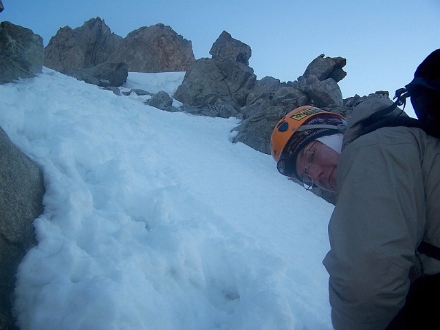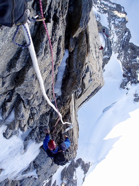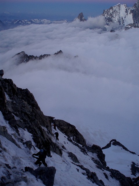 Druhý den se přesunujeme tunelem do Courmayeuru (měří 11 kilometrů a mají v něm vlastní rádio) a odpolene už dupeme po schodech chaty Torino až na Glacier du Géant, kde ve výšce 3300 metrů stavíme BC. Roztopíme trochu sněhu, uvaříme pár Dobrých hostinců (které nejsou v téhle výšce a při nedostatečné aklimatizaci úplne ideálním řešením) a hurá na kutě. Vstáváme asi ve 2 a valíme po ledovci a nástupovým gajblem, kde oficiálně zahajujeme lezení. Měsíc ozařuje okolní skaliska a jeho slabé světlo se odráží od bílého ledovce pod námi. Kolem páté se konečně začíná rozednívat. Od maček občas odlétne jiskra, postupujeme stále výš a pod námi se objevuje peřina mraků. Počasí vypadá dobře, ale je dost kosa. V mixu jsou občas natahané fixy, ale jejich kvalita se dá těžko odhadnout, lepší je se spoléhat na vlastní ruce a motyčku. Za chvíli stojíme pod úplně mega-stěnou a ne všichni se cítí tak docela fit. S Tomem přemýšlíme kdo se poblije první, nakonec se mi podaří tu sojovku nějak udržet v žaludku a rozhodnuti stanout na vrcholu navazujeme se na lana a pouštíme se do prvních metrů kolmé stěny, jejíž úpatí je asi v 3800 m. n. m.. Cesta vede přes Mummeryho balkón a Burgenerovy plotny na ostří pilíře, kde je nutno přelézt předvrchol (Pointe Sella) a pak přes luftózní hřebínek na hlavní vrchol (Pointe Graham). Bohužel je celá stěna ve stínu a dost fučí, na sluníčko se dostáváme až po vylezení na předvrcholek.