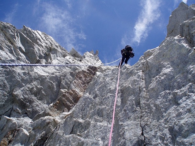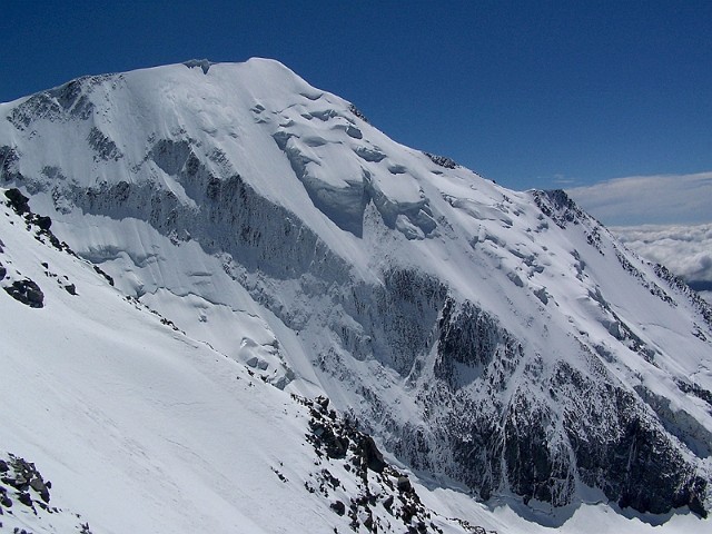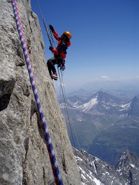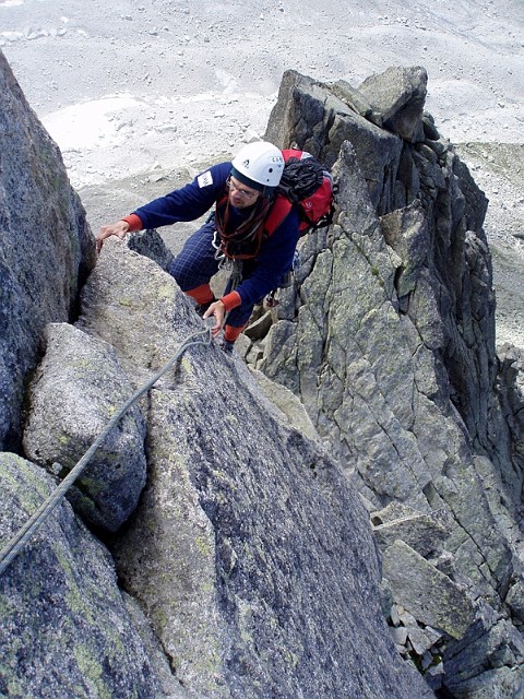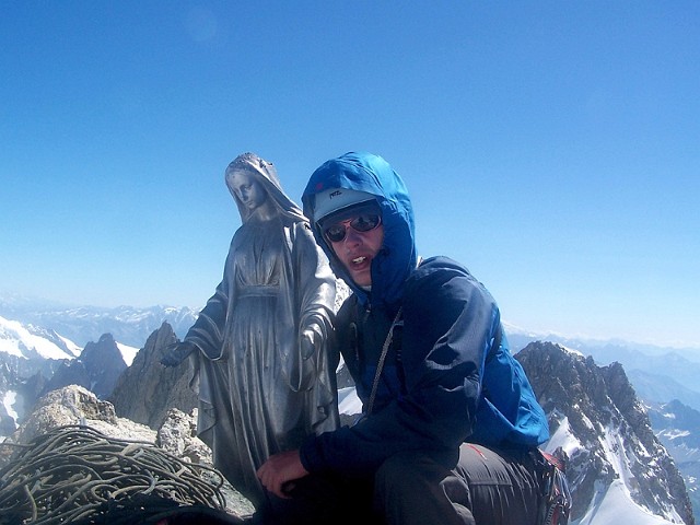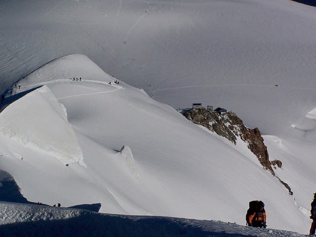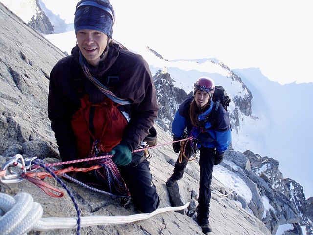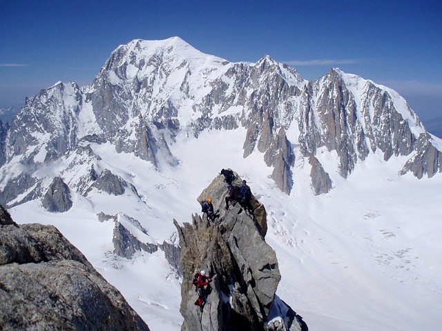Z vrcholu je krásný pohled na všechny strany. Přímo za námi jsou Grandes Jorasses a na druhé straně jihovýchodní stěna Mont Blancu ozářená sluncem. Jelikož za námi valí ještě pár vůdčíků, moc se na vrcholku nezdržujeme - má asi 2x2 metry a rozhodujeme se pro sestup slaněním jižní stěnou - tuto variantu rozhodně doporučuju, je tam dost štandů a je to asi 200 metrů na sněhový hřeben, odkud se dá už sestupovat mixem na ledovec. Nevýhoda odpoledního sestupu je, že mix je totálně rozteklý a gajblem, který byl ráno hezky zmrzlý, se skoro nedá jít, hrozí sklouznutí na nestabilním sněhu. Nakonec se nějak dostáváme na ledovec po kterém se úspešne doplazíme ke stanům.