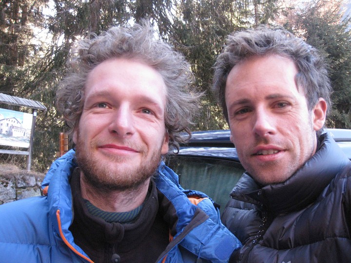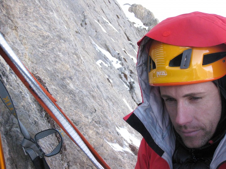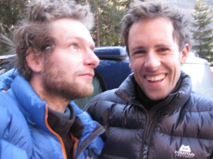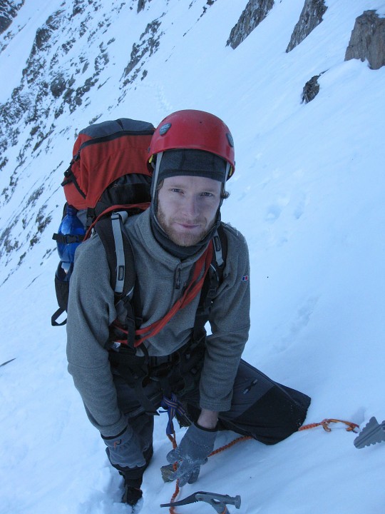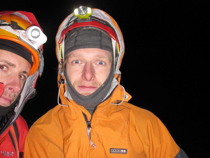 Chvílu jdeme po této lávce, když Ruda zastaví a říká, že musíme nahoru a ukazuje do sněhem pocukrovaných skal, z našeho pohledu se zdají docela rozeklané, takže pohoda. Lezem po skále nahoru, jde to docela dobře, chvílama, když se trochu bojím, tak na Rudu pokřiknu, ať na mě počká. Začínám se rozlízat a mám ze sebe radost. Sklon se napřimuje, jsou to nepříznivě vrstvený břidlice změklý vodou, co se loupou jak perník. Naštěstí jsou mezi nimi někdy mechy a ty parádně drží. Jsem tak 4 metry za Rudou. Zrovna si říkám, že už to docela těžkne a tak se podívám nahoru, kde že si to odpočinu. Tam Ruda a nějak nezvykle moc mlátí cepínem furt do jednoho místa. Háže na mě sníh a led. Říkám mu, co blblneš Rudo?! Zasekni tam ten cepín, zvedni se a hotovo! Ruda, trochu zaškrabe mačkama, ale v podstatě udělá, co jsem mu poradil. Tak co Rudo, jaký to tam je, už je to dobrý? Ne není, je to v prdeli a nade mnou je to uplně v prdeli! Teď je zas řada na mně. Přemýšlím, jsem v lezecke pozici, cepíny mám tak naškráblý do skály a na jedné mačce stojím docela dobře. Zajistit to zatím dneska nešlo nikde a sestoupit to nejde.Rudo, ja jsem taky v hajzlu, tady jak jsem, tak vydržím tak 5 minut. Rudo, musíš někde udělat trochu štand a hodit mi lano. Ja pak slezu tady kousek doleva, je tam taková jako lávka. Ruda se za chvíli ozývá, jo našel jsem takovou skulinku, akorát na špičky dvou cepínů. Jo a už v tom sedím, ááá Vojto, ja ty nohy mám hin. Za chvíli už mi letí lano. Cvaknu se na něj a pomalu slézám na lávku. Loupe se to pod rukama, ale posunuju se. Brblu si pro sebe, kdyby tak ten cepínek tady držel. Ruda si nahoře taky něco brble (později zjistím, že do kamery). Rudo, a kdybych si do toho sedl, udrželo by nás to? Jo to asi jo, říká. Nebudu to zkoušet, ale i to zpraví náladu. Dávám prvního frienda a sunu se dál. Nevím kam jdu, tak se dívám, jak bych lezl zpátky. Po dvaceti metrech obhazuju velkej šutr a pak slézám do trochu vyledovanýho gajblu. V něm zašroubuju dva šrouby do půlky a udělám štand. Beru si bundu, volám na Rudu, asi za 20 minut je u mne. Nějak od té doby, co jsem ho neviděl, narostl. Tak on už si dal pod bundu péřovku! Těch 40 metrů nám zabralo víc jak hoďku.