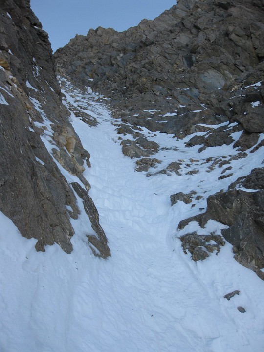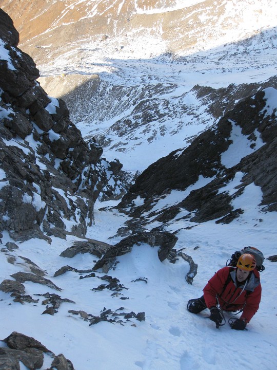 Aby nás zase někdo nepomluvil, daváme si sedáky už na bivaku a jdem. V tvrdým sněhu nasazujem mačky, jde to pěkně, traverz taky v pohodě, sníh se víc sype a na šutrech, co jsou pod nim, vůbec nedrží. Však tadyma zpátky nepudem. Gajbl je taky pěkněj, výlez z něj už horší, hlava si musí zvyknout na tu expozici. Ruda stále přede mnou, on tu hlavu přece jen umí vypnout líp. Jsme ve velké vysněžené lávce, co křižuje celou stěnu šikmo z prava doleva. Tady se jde dobře, jen někdy sníh na šutrech zase nedrží. Naneštěstí tohle není náš směr, nechcem do leva ale do prava přes hřeben a na ledovec, vidíme však jen skály.