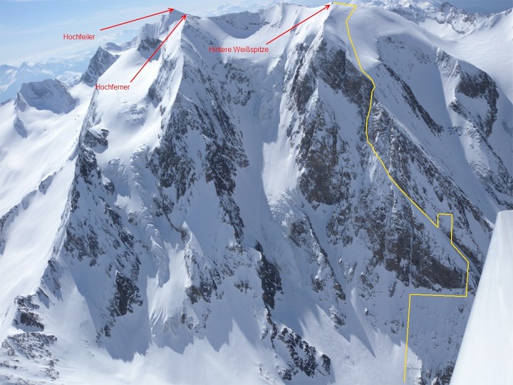 Co polezem, ptám se? No tys něco říkal o těch ledech kolem Hochferneru, kde jsme byli před třema rokama? To jsem sice říkal, ale myslím, že to není ono. Jeden z nich je na podzim hodně těžkej kvůli odtrhům a u toho druhýho, myslím Weißspitze, si nejsem jistej, jestli tam ještě vůbec je. Jo, ten tam bude. Rudo, ale já nemám mapu, svitne mi naděje.