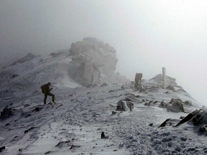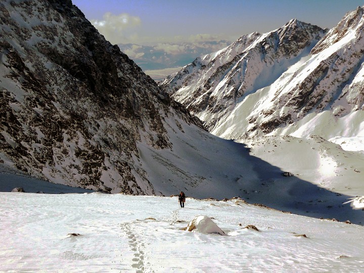 V nedělu ráno zase foukalo a kolem chaty byl klid. Jediná cesta prošlapaná od chaty byla ta na hajzl. Ale v chatě bylo rušno, uklízelo se, plnily batohy, vyrovnával cech na baru. Stisky rukou s chataři, kteří tak zásadně utvářejí běh místního časoprostoru a udržují jeho neopakovatelnou atmosféru. Pak už se objevily postavičky před chatou, jak se kuklí proti větru a oježují mačkama a cepíny, a po skupinkách se spouští Dolinkou dolů k fixům. Na jejich dolním konci se každý ohlédl zpátky k Dolince. Ta už ale vidět nebyla. Zakryla ji znovu bílá opona. Nebo neviditelnost její časoprostorové dimenze?