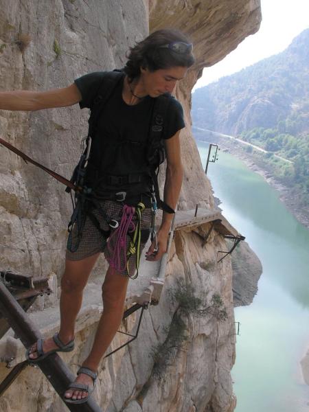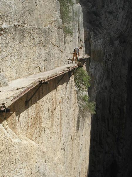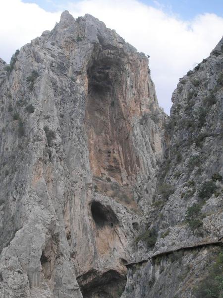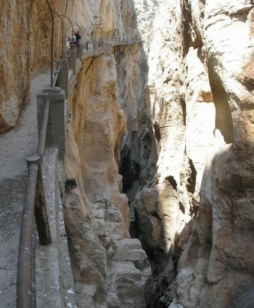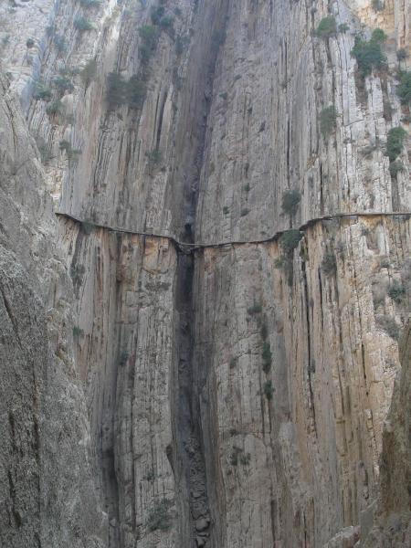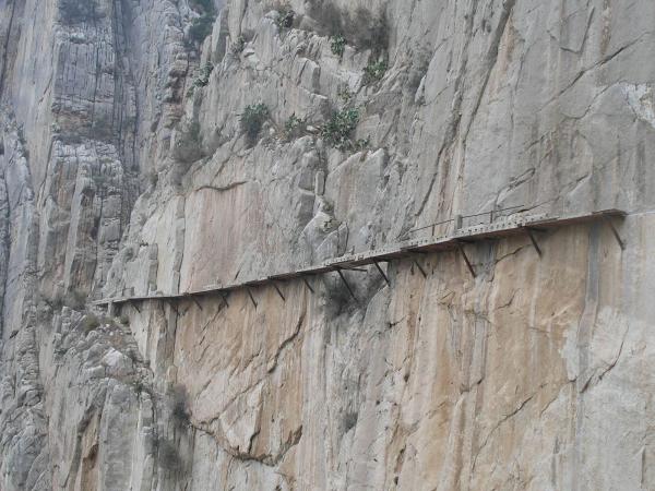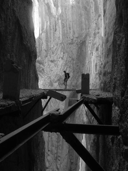 Konečně do soutěsky na Caminito del Rey! Všude jsou sice cedule, že cesta je neudržovaná a nedoporučuje se tam chodit, ale byla přečmáraná něčím jako: "Tempus fugit! Vychutnej si to!!" A tak jsme se řídili tou aktualizací. Cesta soutěskou je po lávkách z cihel, které jsou zasazeny do železniční koleje nebo co a z vrchu jsou přelity betonem. Lávky trčí z poloviny tři sta metrové skalní stěny, která se svým protějškem tvoří úzký kaňon, na jehož dně se dere říčka. Na "Královskou cestičku" se dá dostat jedině pomocí "ferátky". Je to taková výrazná linie směřující šikmo vzhůru na lávku. Na "ochoze" potom nepočítejte se zábradlím a leckdy ani s betonem pod nohama. Už pár desetiletí se cesta neudržuje, protože prý byla nerentabilní. Občas cestu zpestří nějaký ten mostek, díra nebo i tunel. "Bezpečnost" zajišťuje ocelové lanko v nýtech a vaše odsedka. Po stěnách nad i pod lávkami vedou lezecké směry a linie. Nýty dole občas vlivem vlhkosti nevypadají vábně, ale jsou v pohodě. Slanění je taky vyřešeno. Po nějaké době se soutěska rozevírá do rozsáhlého údolí, aby se pak zase mohla zúžit a připravit vám ještě nečekanější pohledy, cesty a scenérii. Cesta zpět vede (pod pokutou 5000 ojro) skrze železniční tunely. K ničemu vás nenabádám, ale nenechte si to ujít ;-) Navíc je to velká zkratka a dostanete se tudy i k dalším sektorům.