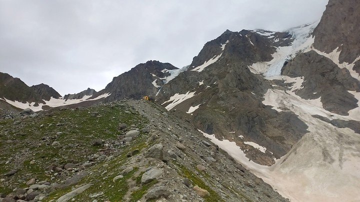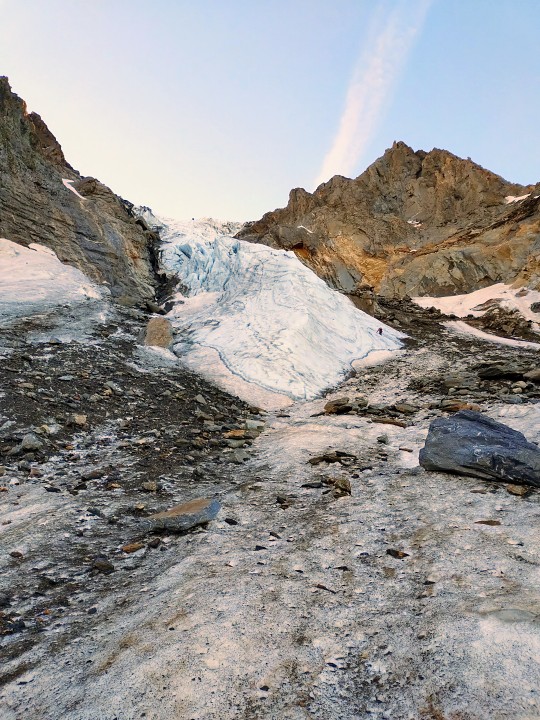 Budíček byl na čtvrtrou a trochu nás trápila vysoká teplota. Posnídali jsme a vyrazili přes sněhovisko k ledovci, o kterém celá tahle výprava je. Naštěstí se sníh nijak nebořil už před nástupem a tak jsme se zase uklidnili. Vytvořili jsme dvě dvoučlenná lanová družstva a s odhodláním se po cestě jistit šrouby jsme vyrazili.