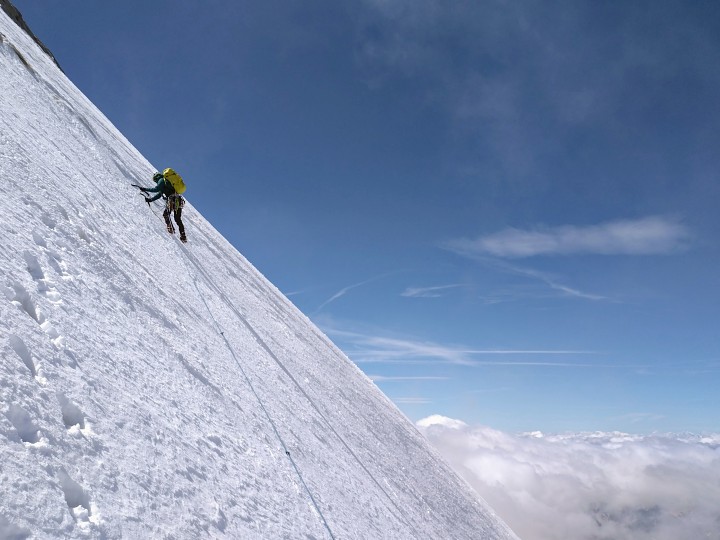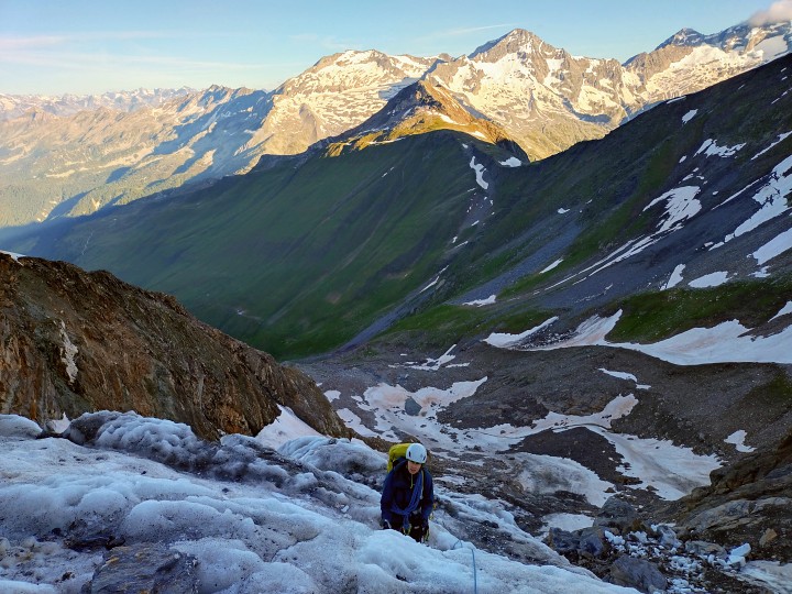 Ledovec v létě a na podzim slibuje kolmé lezení po séracích a v trhlinách, ovšem my jsme měli vše krásně zakryté starým sněhem. Sklon byl většinou do 50° a frčelo to skoro jak skopce - tedy kdybychom to udýchali. A tak v pauze na kyslík jsme tam vždy pleskli jeden šroubek a za hodinku jsme koukali na sněhovou pláň, táhnoucí se k hřebenu Griessferneru. Druhý tým, veden Kubovým zklamáním z absence kolmých ledů, ještě vyrazil k trhlinám pro zpestření příliš jednoduchého postupu. My uvážlivější se nechali předejít zillertálským manželským párem, který si dal výstup místo snídaně a šup zpátky k dětem, a jen tak mimochodem nám šlápl příjemnou stopu.