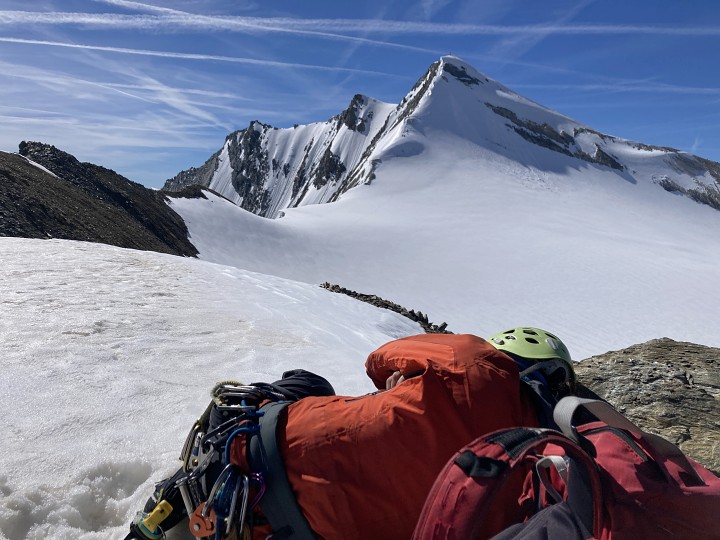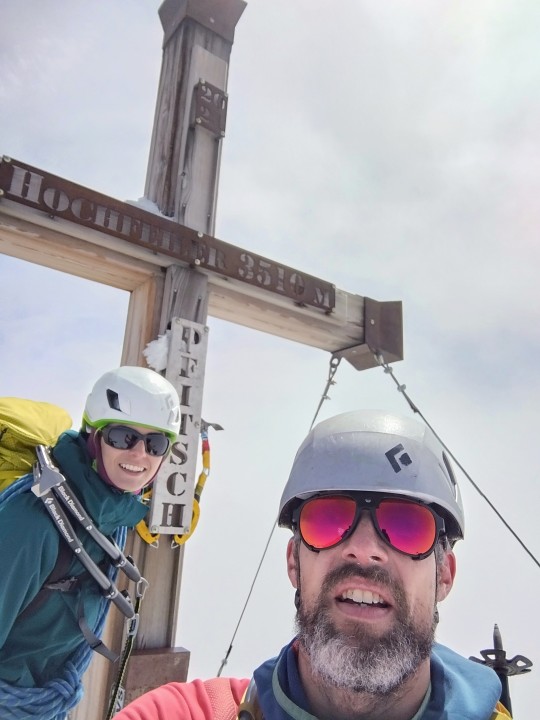 Původní plán traverzovat Weisskarferner k turistickému hřebínku pokazil ten zillertálský pár, který si ještě chtěl vychutnat vrchol Hochfeileru (3509 m) přes jeho severozápadní stěnu. A tak nám to nedalo a dobyli jsme tento středobod vesmíru také. A Kuba s Karolínou už ani jinou variantu neviděli. Výhledy si už ale neužili, protože se jim zatáhlo a tak viděli jen muže na vrcholu Hoch Pfeileru, který kromě kraťasů a bot na sobě měl už jen přetížené břišáky a oholenou hruď. Dámské části mého lanového družstva se to líbilo, ve mě to spíš probouzelo pocity Yorkšíra před smečkou Rottweilerů.