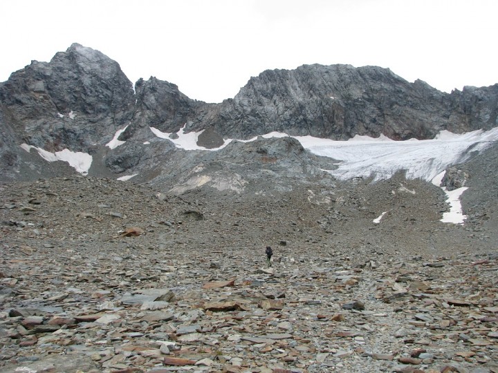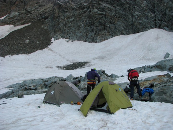 Cesta pak pokračuje po úbočí svahu nad krásným údolím horského potoka přesně na rozmezí Korutan a Tirolska. Na ukazatelích je čas na Salmhutte uváděna 3hodiny. Na Salmhutte se nezdržujeme a pokračujeme po cestě dále směrem k ferratě, která vede na ledovec. Těsně pod ferratou stavíme stany a přespáváme. V noci byla taková vichřice, že jsem chvílema tlačil do stanu směrem ven, aby prohlý neležel uplně na nás. Ráno není kam spěchat. Původně jsme chtěli vstávat v 6, ale budík nezvonil, takže vstáváme po sedmé. Snídaně, příprava, kolem půl deváté vyrážíme.