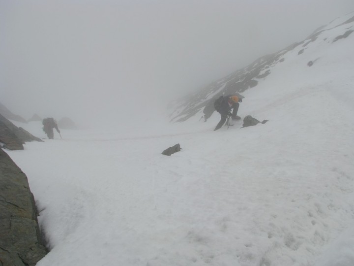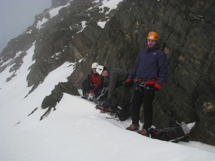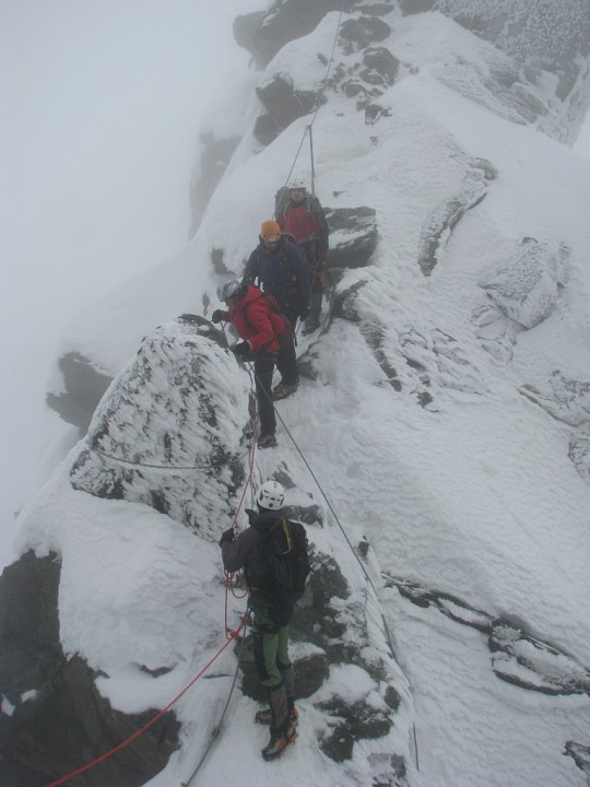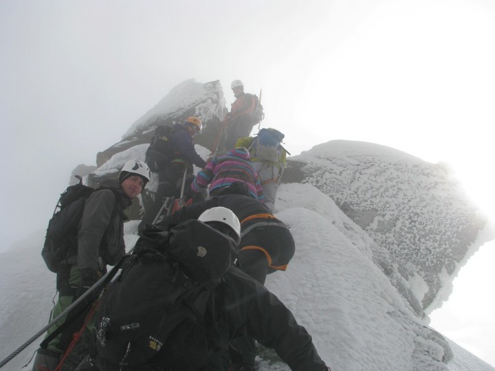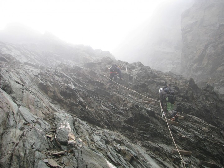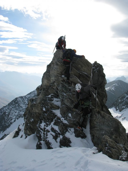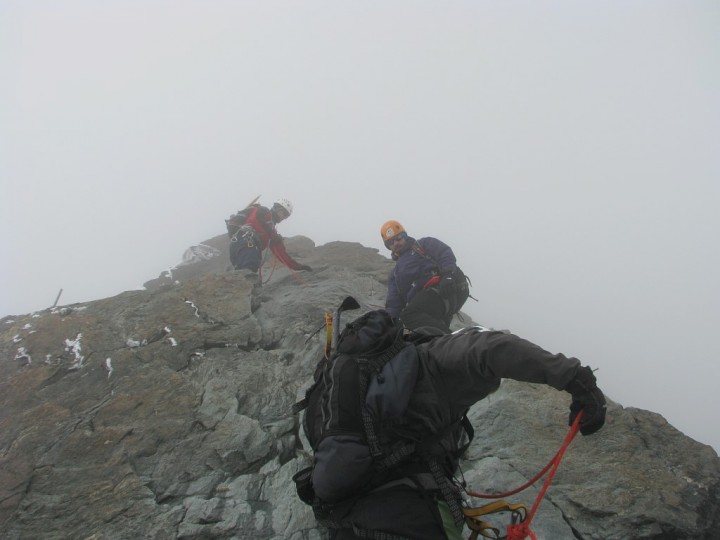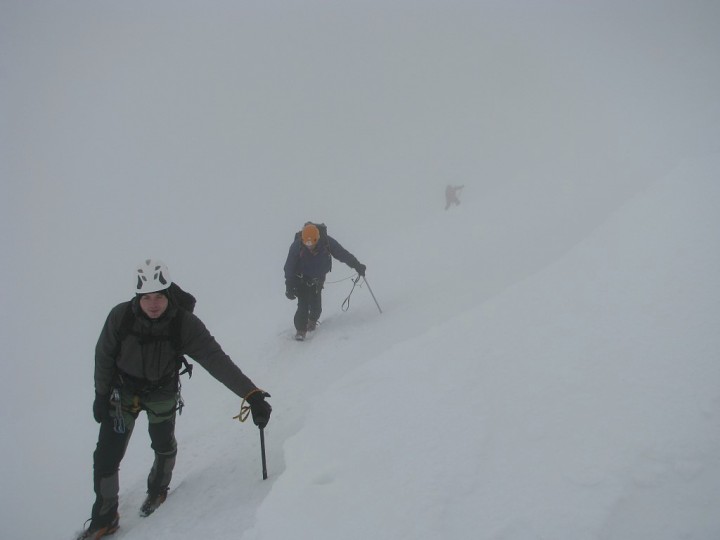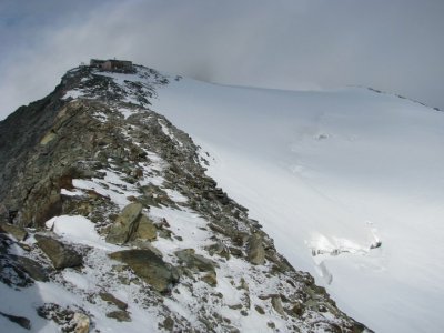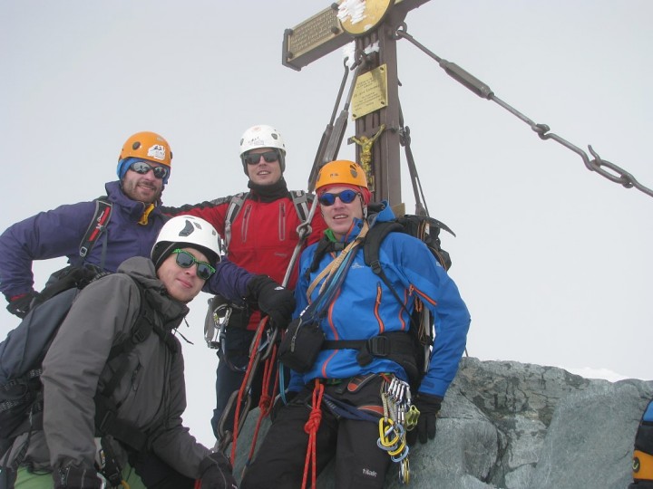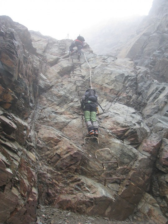 Na začátek rozcvička na ferratě s textilními lany místo ocelových. Nad ferratou se nastupuje na ledovec, kde si někteří nasazují mačky. Cesta po ledovci není dlouhá, snad 15min a pak se dochází na hřeben vedoucí až k Erzherzog-Johann Hutte. Na ní jsme ani ne po dvou hodinách od východu ze stanů. Ve winterraumu se už chystá jiná skupina lidí a jdou na vrchol Glockneru – první lidi který jsme potkali. To jsem si ještě myslel, že je po sezoně a že už tam dalších moc lidí nepotkáme. Než jsme si ve winterraumu dali svačinu, vystřídala se tam další skupina co přišla ze Studlhutte. Po krátké pauze a odložení zbytečností jsme se vydali taky nahoru. Chvíli po ledovci už v absolutní neviditelnosti pod vrcholovou pyramidu. Pak prudčím svahem nahoru na hřeben a nakonec po hřebeni s jistícími tyčemi až na Kleinglockner. Už na hřebenu jsme potkávali skupinky mířící nahoru i dolů, občas se s nimi nepříjemně vyhýbalo. V průrvě a pak skalním prahu mezi Klein a Grossglocknerem ale byla taková zácpa, že jsme raději na malém aspoň půlhodiny vyčkali. Lidi se tam skoro nehli, nebylo poznat kdo jde nahoru a kdo dolů a furt se někdo někam tlačil. Holt po sezoně ještě nebylo. Nejvíc tam bylo asi rakušáků a poláků. Potkali jsme ale i českou dvojici. Jak jsme nechali projít asi 4 skupinky, cesta nahoru se trošku uvolnila, takže jsme mohli jít na vrchol, kde jsme byli 4hodiny po odchodu od stanů. Pár fotek na vrcholu u kříže, nějakou dobu jsme čekali zda se nevyjasní, ale bylo to bez šance. Vydali jsme se tedy na sestup. Chvíli nás zdržovala nějaká skupina rakušáků, po chvíli jsme je ale předběhli. Po dvou hodinách jsme byli zpět u stanů. Už začínalo pomalu kapat. Sbalili jsme tábor a za deště jsme došli do winterraumu v Salmhutte. Pěkný, s postelema akorát pro 4. Snědli jsme poslední zásoby a šli jsme spát. Ráno jsme sešli k autu a přes muzeum Redbull – Hangar 7 na letišti v Salcburku jsme jeli do Brna.