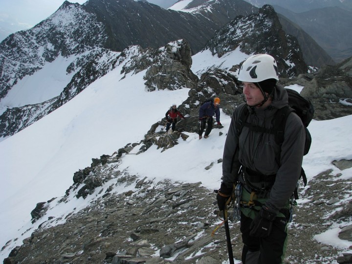 Na Grossglockner jsme se s Vojtou, Kotysem a Ondrou vydali méně frekventovanou normálkou z Glocknerhausu přes Salmhutte a Erzherzog-Johann Hutte. Cesta od Glocknerhaus klesá dolu k přehradní nádrži přečerpávací elektrárny, dále pokračuje po dvou hrázích do prudčího kopce na hřeben. Na hřebenu se otevřou pěkné výhledy na Pasterze Glacier, největší ledovec rakouska a východních alp. Jeho délka je asi 8.4km. Za posledních 150let ho ale hodně ubylo.