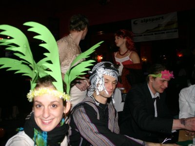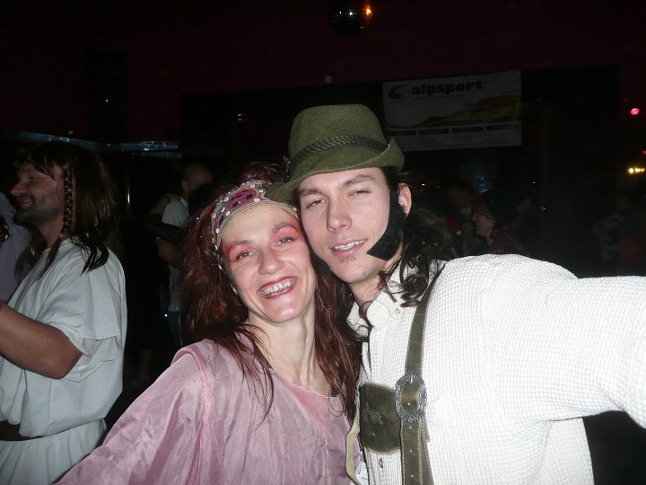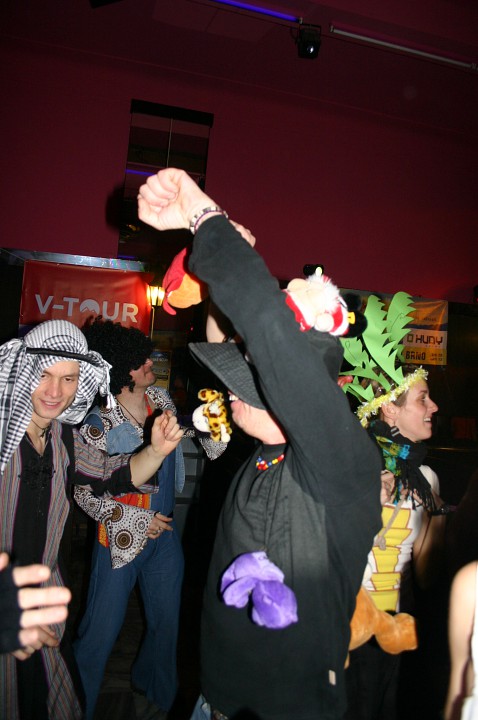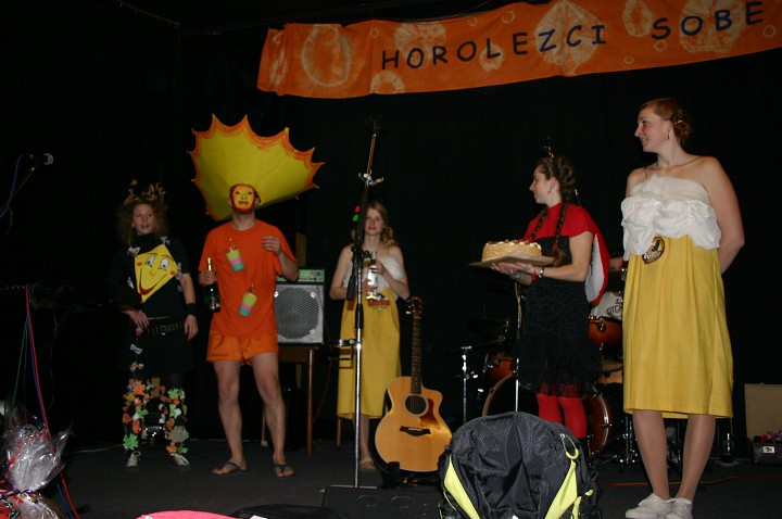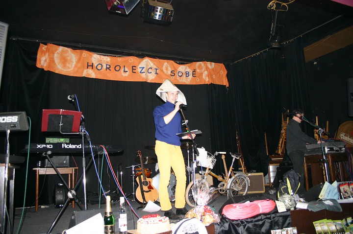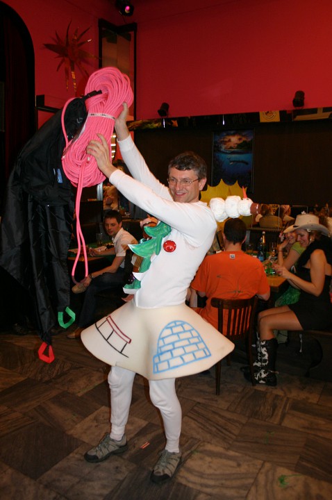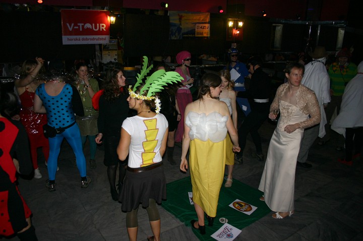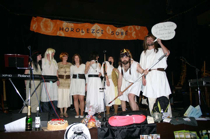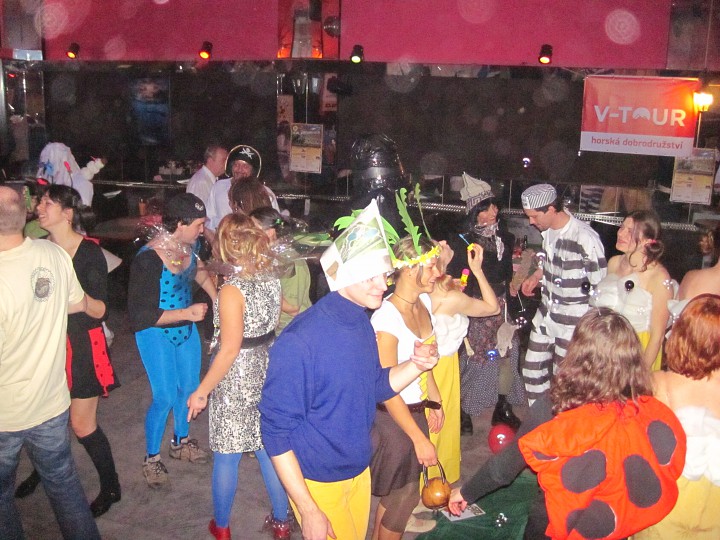 Při prodávání tomboly nám výherchtivci div neutrli ruce! Každý samozřejmě toužil vyhrát především to lano, pravým šťastlivcem se stal Rolf. Jeho meganadšení z výhry muselo dojmout i ty nejdrsnější horaly, takže jsme mu to všichni místo závidění opravdu přáli. Chybět nemohlo ani vyhlášení nejlepší masky, o čemž rozhodli samotní účastníci. Největší úspěch sklidil ,,Brněnský kokot´´ alias nový orloj ze Svoboďáku v podání Honzi Sejka. Při předávání cen jsme se od něj dozvěděli, kolik je doopravdy hodin, namísto nějakého vypadávání koulí, což považuji za největší úspěch!