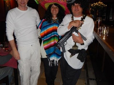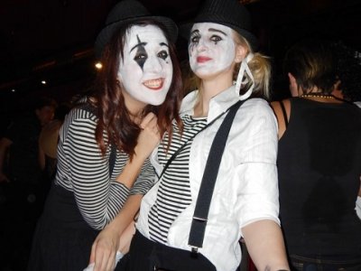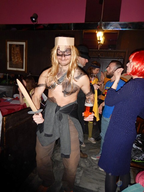 „Kolik lidí se vejde do udírny?“ zaklínadlo, které rozpoutalo jednu z tradičních fází plesu, dezorganizované odmaskování. V mžiku se slítly mouchy, včely, ba i žraloci a svorně se přičinili o demoliční rozklad prostorově nejvýraznější masky na prvočinitele. Při pozorování toho reje jsme se neubránili myšlence, že je skoro zázrak, s přihlédnutím k tomu, v kolika brněnských podnicích už před horolezeckými dýchánky (dřívějšími čtvrtky a teď i stejně promiskuitními středami) mají dveře na petlici, jak odolně se Hvězda drží. Vyděržaj pionýr! :)