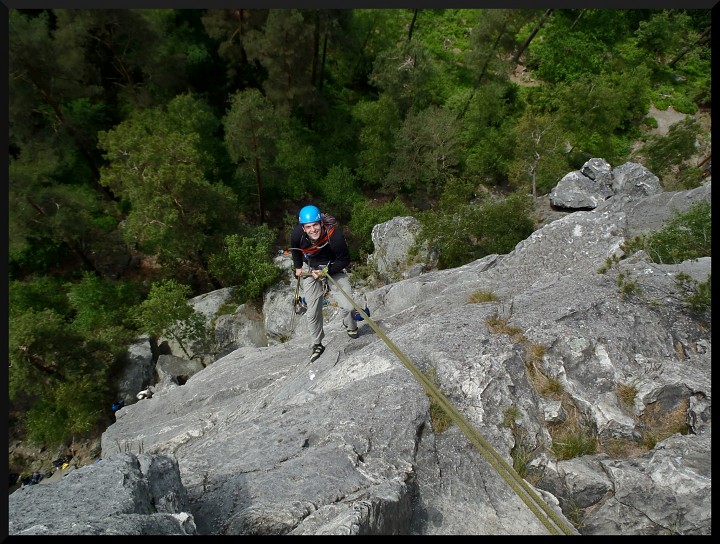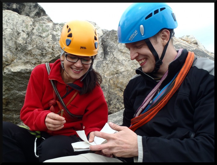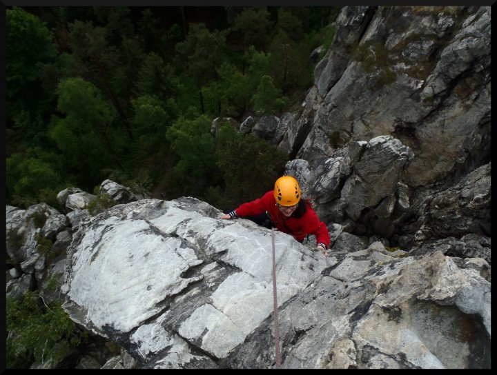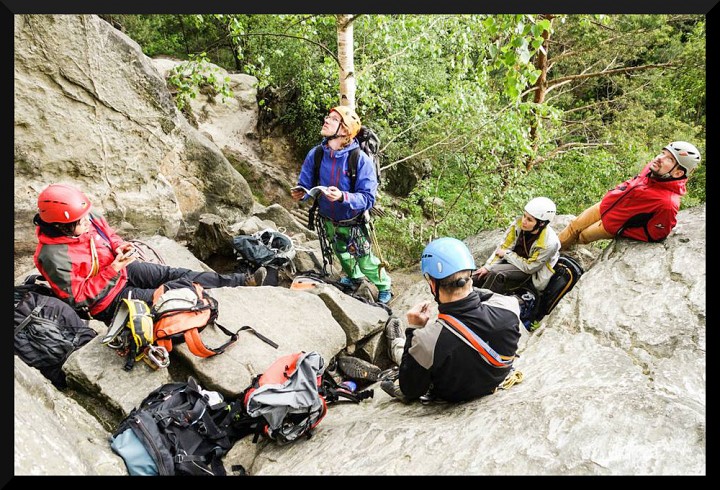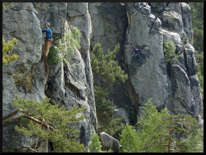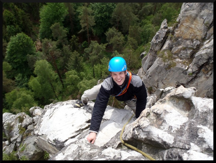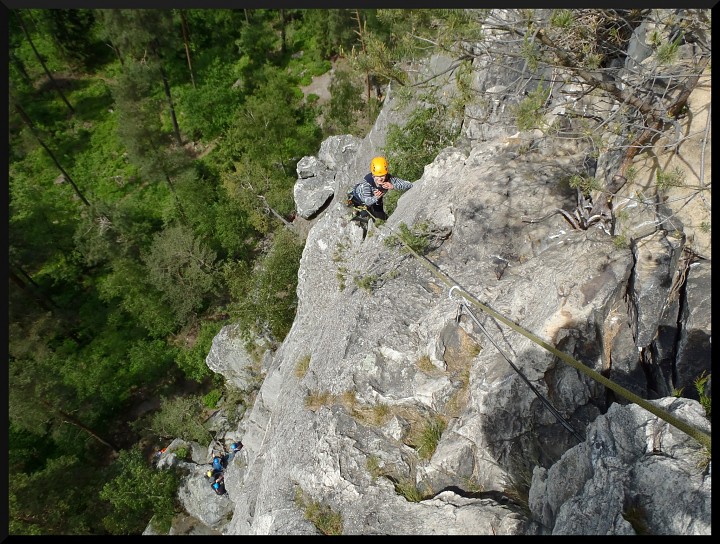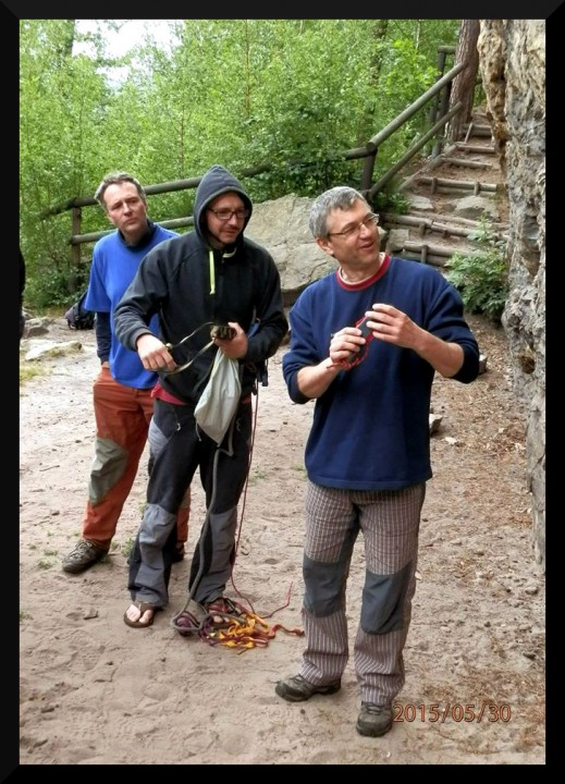 v pizzerce na Malé skále. V neděli ráno bylo slunečno, takže jsme opět vyrazili na skály. Kolem poledne se jeden místní lezec postaral o názornou ukázku záchranné akce, když se po necvaknutí kruhu odporoučel asi z 8 metrů k zemi. Spolu s kamarády z Lokálky, kteří zde byli také s horoškolou, jsme mu poskytli první pomoc, zavolali vrtulník a odnesli ho na nosítkách k průseku v lese, kde už ho vyzvedl žluťásek Kryštof. Lezec měl zřejmě zlomená žebra a ránu na hlavě (neměl helmu), ale snad bude v pořádku. Po záchranné akci a svačině jsme pokračovali v lezení. Milan natáhl krásnou dvoudélkovou Západní cestu na Střední věž IV, cesta šla hezky dojistit smyčkami přes hroty a uzlíky. Po dolezení posledních cest jsme se všichni vydali k domovu. Akci hodnotím jednoznačně pozitivně, poděkování si zaslouží instruktoři za tahání cest, Rolf za zorganizování celé akce a nováčci za výdrž a odhodlání při odhalování krás pískovcového lezení..