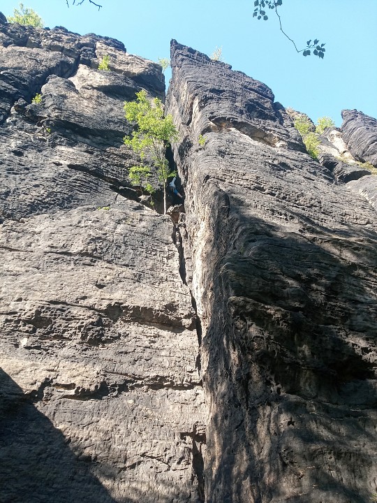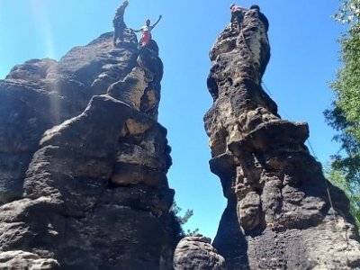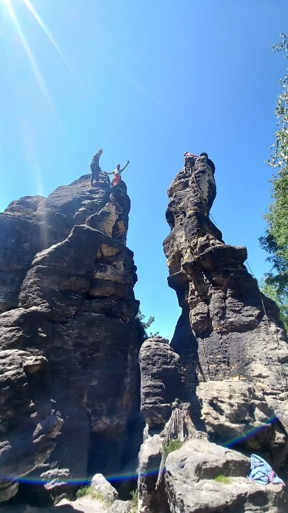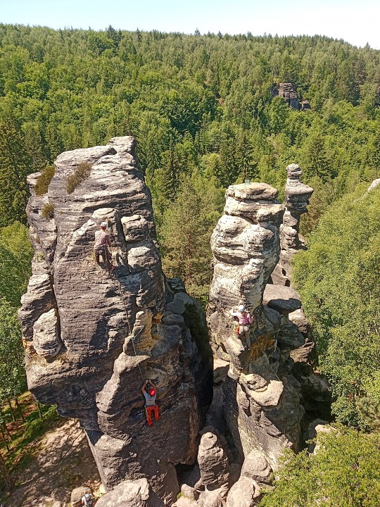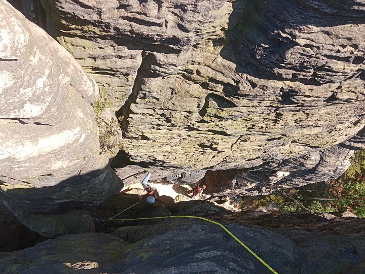 Po spočítání ztrát a naplánování nákupu, abychom neumřeli hladem a žízní, jsme vyrazili do skal intenzivně horoškolit. Úspěšně jsme se rozpustili v okolních skalách a večer se ještě úspěšněji zase slezli v našem kempu. Sobotní noc byla velkolepá, plná ohně a hudby. Proti-liškovou hlídku jsme poctivě drželi až skoro do svítání.