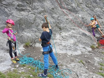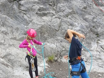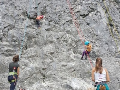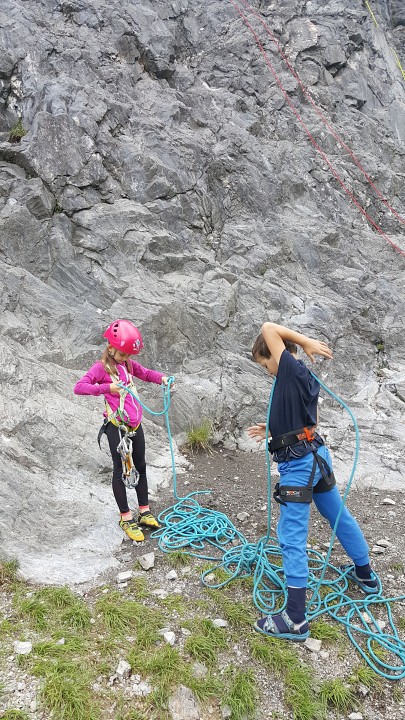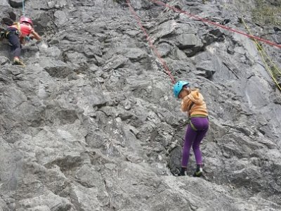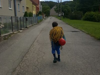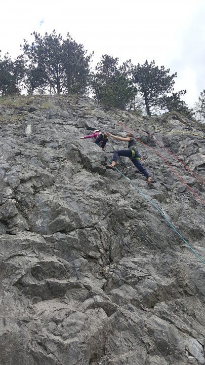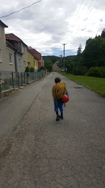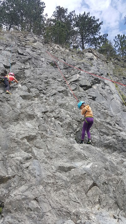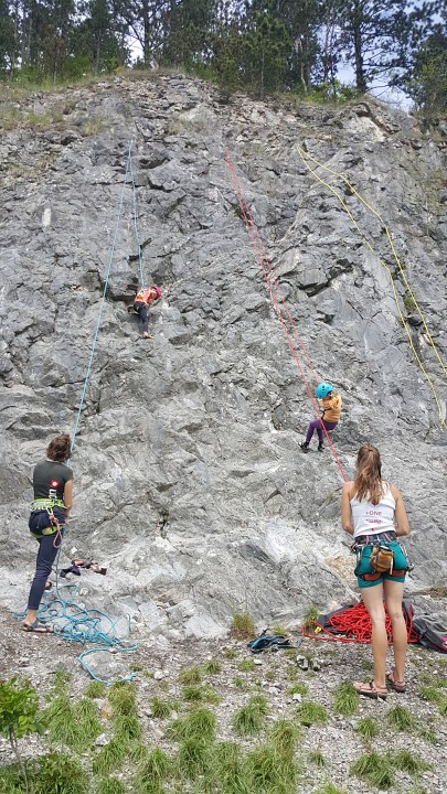 Jak bylo v plánu již od začátku, vyrazili jsme první červnovou sobotu na skalku do Lažánek. Cesty v obtížnosti cca 2 - 4+ hustě osázené borháky jsou ideálním místem pro lezení s dětmi. V průběhu dne si děti vylezly spoustu cest, seznámily se tak s lezením na laně a na skále, vycvakáváním/ cvakáním expresek, navazováním na lano, smotáváním lana a snažily jsme se najít i spáru vhodnou pro založení friendu na ukázku. Většina si vyzkoušela cesty i sama tahat. Velký úspěch na závěr dne mělo lezení se zavázanýma očima na top rope (doporučuji vyzkoušet!