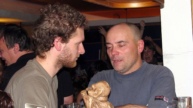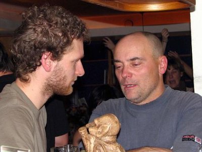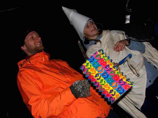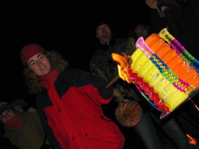 A pak už jsme se s mlsnými jazýčky vydali konečně na to prasátko a zlatavý mok, jež na nás čekaly na chalupě. A opět se rozproudila zábava. Půlnoc byla oslavena slavnostním výskokem z oken gruntu nejotrlejšími horolezci a horolezkyněmi, kteří byli vylosováni v okurkové loterii a podnikli tento čin výhradně pro pobavení publika s okurkou vraženou v puse. V závěru se jídelna proměnila v lampiónový sál vlnících se těl v pomalých rytmech při svitu svíček.