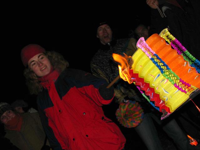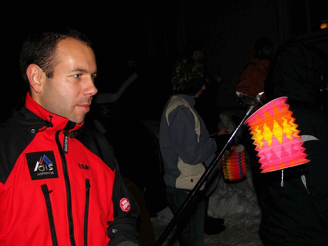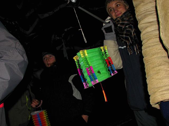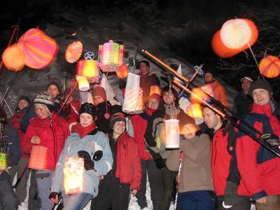 A večer, když už jsme se všichni sešli nad teplem roštu vonícím budoucí pochoutkou jsme také zapálili své lampióny... Pohled to byl monumentální. Vyšlapanou cestičkou v bílém sněhu se vydal průvod světýlek do míst, která je vždycky lákají a lákat budou, do skal, kde se mnozí z nás začínali seznamovat s tím krásným druhem šílenství - lezením. A protože tyto místa pečlivě střeží skalní skřítci, přišli jsme je my se svými lampiony pozdravit a udobřit pro další výstupy na vrcholky jejich království. Cestou z Drátníku jsme se také zastavili u slavného sloupu, který byl tímto okamžikem pasován na SLOUP ČAKA NORISE, velkého náčelníka všech horoškol, a věnován modernizaci telekomunikace na Vysočině.