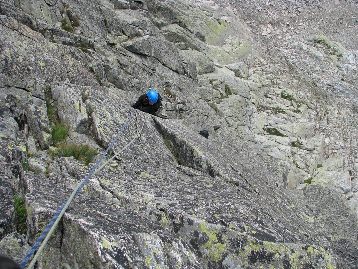 Týmy se rozpadají. Pod vlivem předpovědi a zřejmě již i únavy musíme přeskupit lezecké týmy. I přes avízované hnusné počasí to nevypadá tak zle. Ti „odvážnější“ vyrážíme v počtu pěti směr na Čierny štít. Zbytek se rozhodl pro stranu Žeruch. K nástupu pod Čierny štít jdeme poněkud krkolomně. Hned za prvními řetězy do Velké Zmrzlé doliny netrefujeme další cestu a šplháme se kolem potoka (tedy až na Pawra, který je rychlejší a má lepší orientaci). Ale po zdolání tohoto úseku, za povzbuzování vulgarismy se s Pawrem potkáváme a dál jdeme společně. Po 2h chůze jsme pod Čiernym štítem. Není to úplně vysoká stěna, ale celkem monumentální. S Kristy a Verčou nastupujeme do Puškášova pilieru a Pawr s Kubou do vedlejší cesty Stanislawského depresia. S Pawrem lezeme téměř současně, když se během druhé délky ozve z vedlejší cesty kurvování a pád. Pawr hupsnul do frienda a vyhodil si rameno. Slaňuje, rameno naskočilo. My po domluvě lezeme dál. Třetí délku jsem netrefil a lezu přes vzdušný traverz poněkud vlevo. Holky to komentují nadávkami. Začíná se zatahovat a za Lomničákem to pěkně bouří. Na vrchol už to máme jen na délku lana lehkým terénem a začínají padat první kapky. Padá mlha a snažíme se s holkama popohnat, k tomu všemu si Kristy vyhodila koleno, ale přestává pršet. Pomalinku sestupujeme dolů, občas se válí mlha, v dálce znějí hromy, ale u nás pořád nic. Nemůžu najít sestupovku, když na mě holky volají, že mají mužíky. Trvá to nějakou chvíli, ale konečně jsme pod kopcem a můžeme si sundat cajky. Cestu na chatu zvládáme vcelku rychle a již správnou cestou. Rolf je již v očekávání našeho příchodu. Schází ještě Petr s Ivčou a Terkou, ale i ten se během hodiny vrací. Na to jaká byla předpověď, tak jsme dnes děti štěstěny. Předpověď pro zítřek nabízí déšť, takže se za mohutného povzbuzování Rolfa přesunujeme do baru, kde to začíná žít. Když už to vypadá na zajímavě se rozjíždějící večírek, tak se opět personál v podobě parádně protivnýho „vrchního“ staví na zadní a rázným způsobem ukončuje naši kytarovou a stolovo-taneční aktivitu.