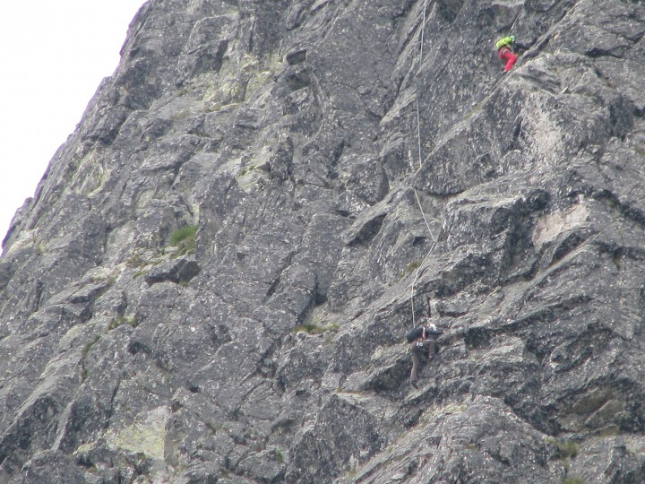 A opět ranní zemětřesení v 6,30h. Předpověď na dnešek slibuje nějaké srážky, ale venku tomu tak rozhodně nevypadá. Někteří z nás si proto vyhlašují rest day. Ostatní stateční jdeme opět směrem na Žeruchy, jen Petr s Aničkou volí Jastrabku. S Michalem a Kristýnou lezeme Ľavý žľab, a protože i Rolf má rest day, tak „jeho“ svěřenci Karlos a Luďa lezou za námi. Kolem se motají i ostatní posádky naší výpravy. Tentokrát již vynecháváme celý Kozí hřeben a slaňujeme do Červené doliny v žlabu před Západnou Žeruchovou vežou, kde jsou 2 slaňáky. Opět se všichni pohodlně vracíme před večeří. A protože hlavní kytarista výpravy byl svěží a odpočatý, tak se pokoušíme den zakončit večírkem. Bohužel této snaze se staví do cesty personál, který úderem 22h zatvára bar a jde se na kutě. A výhled počasí na zítřek – dopoledne snad, ale odpoledne srač/žky.