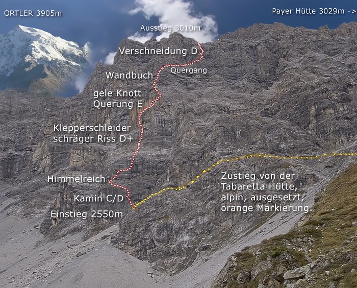 S Martinem Hlouškem, Kubou Wágnerem a Vojtou Rujbrem jsme se tentokrát vydali ze Suldenu krásnou Tabaretta Klettersteig ferratou přes Tabaretta a Payer Hutte. Již známá cesta začala ve čtvrtek 26.6. po poledni v Brně. Po krátkých nákupech, obědu v Mikulově a asi 9 hodinách cesty jsme byli v 23.00hod v Suldenu. Protože pršelo, hledali jsme spaní aspoň trošku pod střechou. Naproti lanovce byl vstup do půjčovny lyží s mírným podloubím a hlavně pod střechou. To bylo naším hotelem na dnešní noc. Po rychlé večeři jsme šli spát. Ráno nás pomale budil závozník, jež vezl zásoby do hotelu u půjčovny, který měl stejný vchod. V klidu jsme se pobalili a kolem deváté jsme přeparkovali auto na začátek Suldenu k parkovišti u začátku značené trasy číslo 4 směrem k Tabaretta Hutte. Cesta vedla nejdříve pohodlně lesem ve stínu, pak ale les skončil a dostali jsme se na morény pod severkou Ortleru. Vyledněná rampa vyhlíží velmi majestátně. 1200m 55 stupňového sklonu z ní dělá velmi uznávaný a vyhledávaný výstup. Bohužel o tomto ale i svědčí počet neštěstí, jež jsou připomenuta na velkém kameni na konci morény pod Tabareta hutte a více pak v Suldenu u malého kostelíku. Na konci morény se cesta trošku zvedla a v 11 jsme byli u Tabaretta hutte (2556m). Po rychlém obědu jsme se vydali pod stěnu Tabaretta Klettersteigu. Zajímavá značka upozorňuje že cesta není vhodná pro dámy se psy a babky s nůšemi.