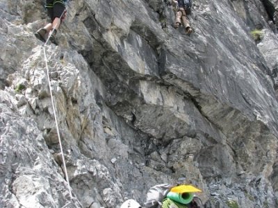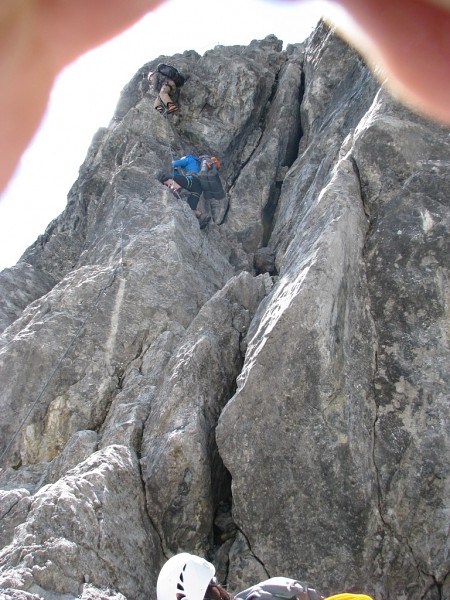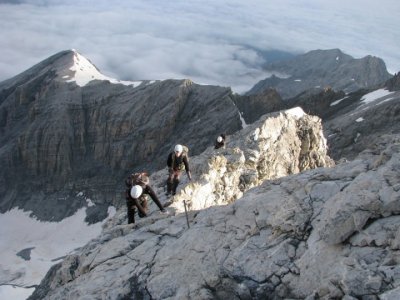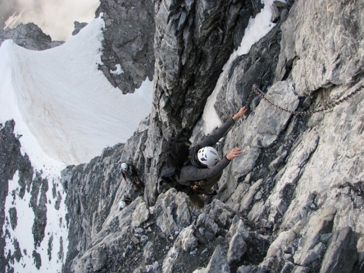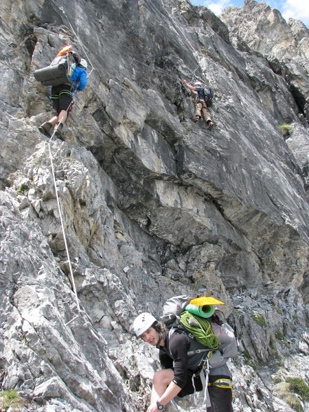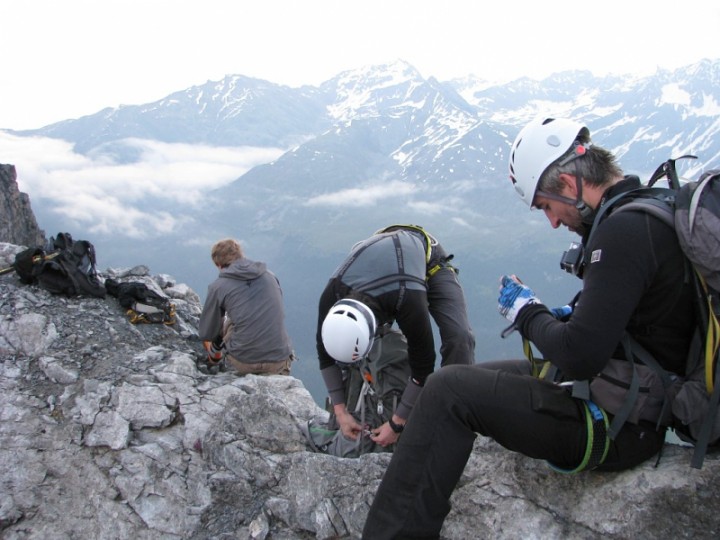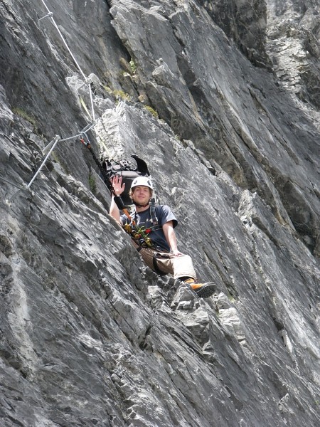 Krásná, ale obtížná Ečková ferrata (jedno Ečkové místo, pár D/E a pak lehčí) Vás hned na začátku prověří. Často zde nejsou moc nohy ani chyty, takže lezete pouze rukama za ocelové lano a nohama tlačíte do stěny. Kramle zde nejsou, takže opravdu často jen na rukách J. 500m stěna se dá projít za dobu kolem tří až čtyř hodin v závislosti na tom jak jste rychlý a jak máte těžký batohy. My jsme je měli plný jídla, hader, spacáků, věcí na vaření apodobného, takže jsme se pohybovali o něco pomaleji. V 5 jsme došli na Payer Hutte (3029m). Nocleh za 13€ s Alpenvereinem se nám zdál v pohodě, takže jsme se nastěhovali na konec velké místnosti nahoře ve střeše. Čisté postele byly samozřejmostí.