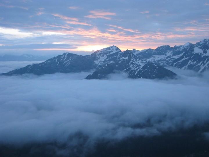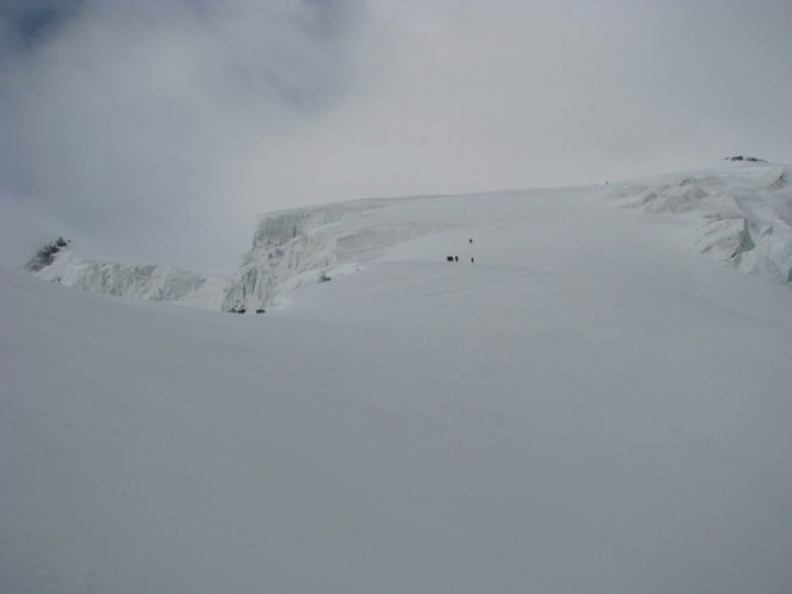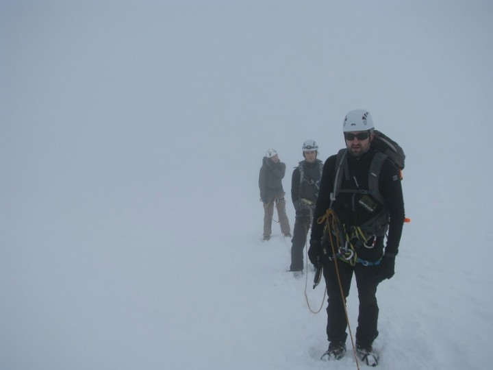 V sobotu jsme měli budíka na 4, abychom v 4.30 vyrazili. Budík jsme odsunuli na 4.30 a kvůli mírnému rannímu zpoždění jsme vyrazili v 5.30. počasí bylo jakštakš. Pod námi nad Suldenem mraky, nad námi ještě docela jasno. Nad chatou vede cesta chvíli po zbytku hřebínku nad ferratou, dále se stáčí doprava kde obchází Tabaretta spitze. Za ní se cesta na chvíli přehoupne na druhou stranu hřebene nad Trafoi, odkud jsem si mohl prohlédnout cestu, kterou jsem absolvoval nedávno. Sněhu tam nyní bylo o poznání méně. Po krátkém traverzu cesta vedla opět na hřeben. Jedničkové a dvojkové pasáže nad krásnou expozicí vyústili trojkovým asi 70m stupněm, který byl ovšem jako ferrata zajištěn řetězi, takže se tam lezlo v pohodě. To už jsme došli do sedýlka Scharte (kde jsme skončili minule) a tam jsme nasadili mačky. Asi 100m pod Lombardi biwakem cesta po ledovci obchází skalní masu zprava. Dále se jde nahoru pod krásnými séraky přes velkou trhlinu, kde vede sněhový most. Zde už se počasí začalo kazit, přicházely mraky a viditelnost chvílemi byla tak na 20m. tak jsme si to šlapali nahoru bez výhledů „nudně“ nahoru až jsme došli na místo, kde všici seděli a poplácávali se. Nechtělo se mi věřit, že by to už byl vrchol, ale dotaz na nějakého borca mi to potvrdil (ptal jsem se, jestli jsem už na vrcholu Ortleru, borec si asi myslel, že jsem uplně mimo) a pak už jsem i viděl vrcholový kříž. Nahoře jsme byli po 3,5 hodinách. (čekal jsem že to bude na 5hodin) Po krátkém focení a svačině nahoře jsme zahájili sestup. Viditelnost byla mrzutá. Při sestupu chvílemi sotva 5m a někdy jsem se díval, zda vůbec na zemi vidím stopy – jestli jdeme správným směrem. Po ledovci jsme šli navázaní a tak jsme to nechali ještě na hřebínek s 70m lezením, kde jsme se jistili občasným založením něčeho, nebo cvakáním do řetěžů. V 11.30 jsme byli zpět na Payer Hutte, kde jsme pobalili věci které jsme tam nechali a šli dolů k autu. U auta jsme byli ve 3 odpoledne a na večer jsme přes bezcelní zónu Samnaun, kde jsme levně natankovali jeli do Brna.