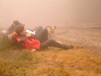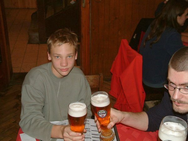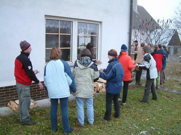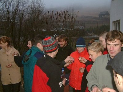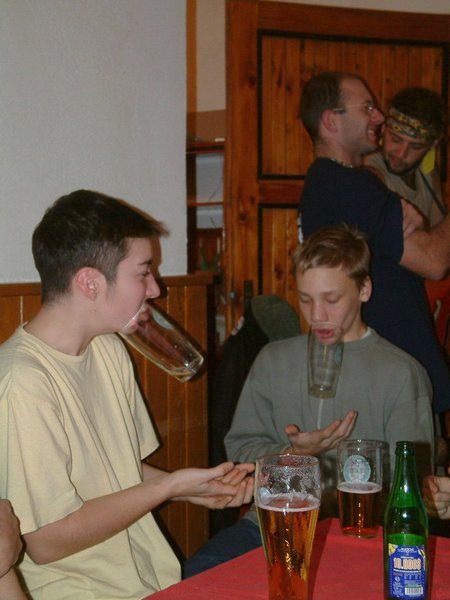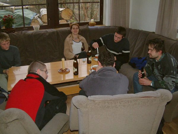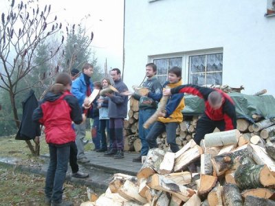 Zkusíme nové penziony. První u Profesora je zavřený, druhý rozjíždí provoz, ale majitel nás vpouští dovnitř se slovy "Kolik Vás je?" Jediný kastl piv vyšuměl rychle, protože takovou přepadovku Luďa (majitel) nečekal. Luďovi přivážejí starousedlíci dřevo do krbu a my přemýšlíme koho pošlem pro auta na Medvědinec, protože se vůbec nikomu nechce pěšky. Luďa navrhuje, ať mu složíme dřevo pod okna a pak nás hodí na chalupu. Vše dojednáno. Brigáda začíná. Na chalupu se dostáváme před pátou abychom stihli přednášku. Přednášející nezdržoval a šel rovnou na věc.