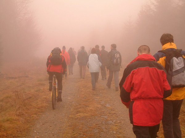 První co dorazili na Návrší jsou nemile překvapeni. Nápis "oprava jídelny od 15.11." nás vyvádí z míry. Každý si musel nechat zajít chuť na čaj, sodovku, rum, pivko a další tekutiny, co dokáží povzbudit lidský organismus. Jdeme do Stříbrnic. Stříbrnická hospůdka pro opravu zavřena. Padají první úvahy o taxíku, stopu, autobusu a tak. Valíme do Starého města. Na křižovatce do Kunčic všechny přesvědčuji, že i v Kunčicích byla kdysi hospoda, a že je tam možná dodnes. Je to blíž než Starák, tak jdeme. Hospoda má nápis "hospoda" pohozený na zemi před barákem!!! A co teď...