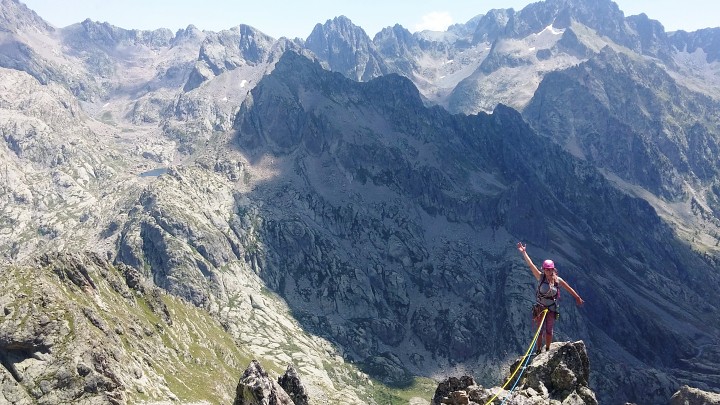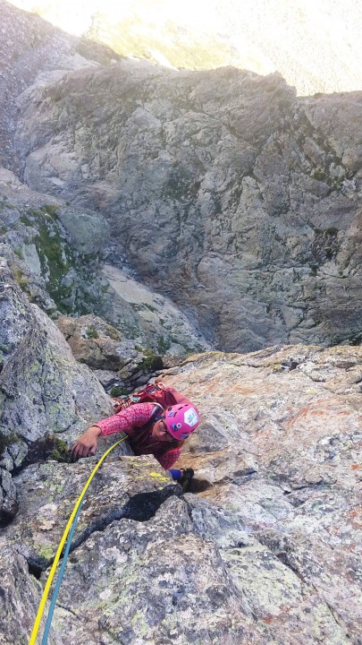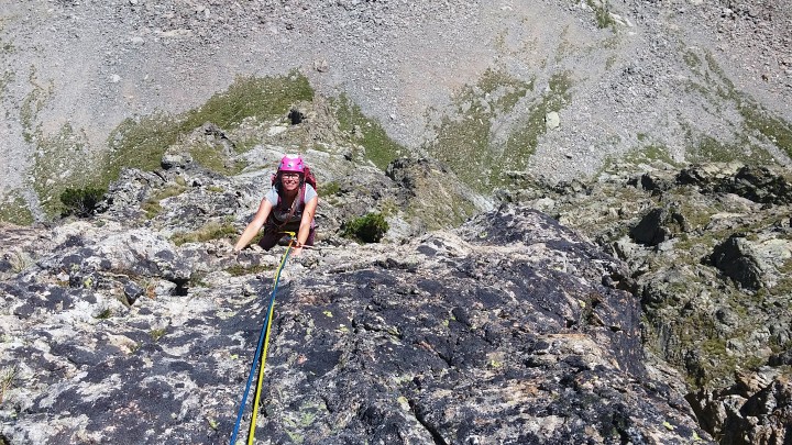 Po dni stráveném cestou k moři, koupačkou a cestou zpět jsme si dali jako poslední lezecký den východní diretku na Cayre Colomb. A zase nás potěšila skála i cesta. Tentokrát jsme konečně mohli využít i náš matroš a kromě pár skob jsme si zakládali co hrdlo ráčilo. Cesta je zakončená ostrým exponovaným hřebenem na hlavní vrchol, který stál rozhodně za to. Sestup už byl opět s překladem do čaštiny, navíc celkem jasný.