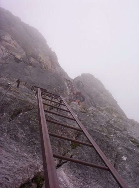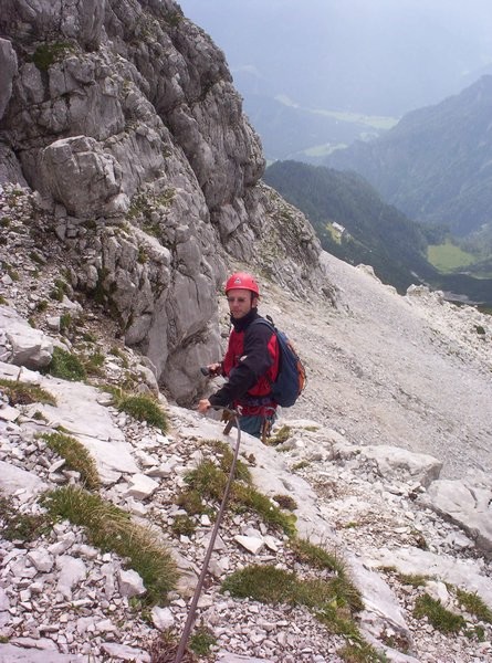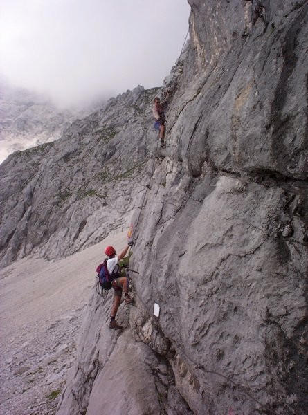 Vyrazili jsme. Po třech hodinách trmácení do kopce jsme došli na chatu Prielschutzhaus, kde jsme ani na okamžik nezaváhali a utratili první Eura za pivka. Čekání na ostatní se nám protáhlo, a tak jsme měli trochu v hlavě. U chaty se celý zájezd rozdělil na skupinu Ferratisti a skupinu Pěšáci. Na ferratu nás šlo sedm a zbytek po chodníku obklikou také na vrchol Groser Priel. S námi na ferratu šli nějací klienti, kteří nám až pod samotným nástupem cesty oznámili, že neumí obléknout sedací úvazek a že vlastně nikdy na ferratě nebyli. Dost nás to zaskočilo. Borek prohlásil "Jdeme pryč a rychle. Já to nechci vidět." Nakonec se od nás odpojili v sedle a rozhodli se pro návrat.