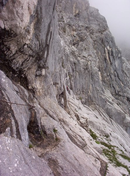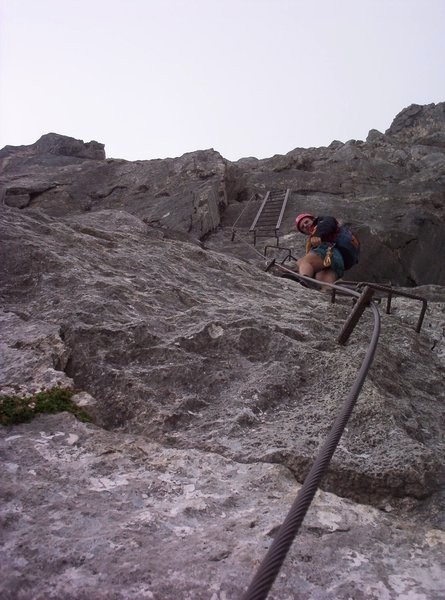 Výstup samotnou ferratou začíná prvním výšvihem do sedla, který dal zabrat "klientům". V popisech je to psáno jako nástupní stěna zvaná Lokomotiva. V sedle u památníčku Berta Rinesche se přechází na východní stranu stěny, ve které vede zbytek cesty. Následuje dlouhý traverz s několika vzrušujícími místy, který střídá první klíčové místo, skalní výšvih vybavený žebříky a kramlemi. Exponované traverzy s místy uvolněnými kameny střídají strmé skály. Tak to jde až k vrcholové knize, která je schována v jeskyňce asi ve dvoutřetinách stěny. Některé žebříky jsou kolmé až mírně převislé. Po skončení žebříků začíná hřeben vedoucí až na vrchol. Ten nás pak dovede až k mohutnému červenému vrcholovému kříži.