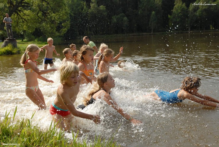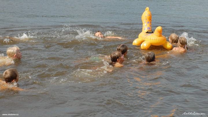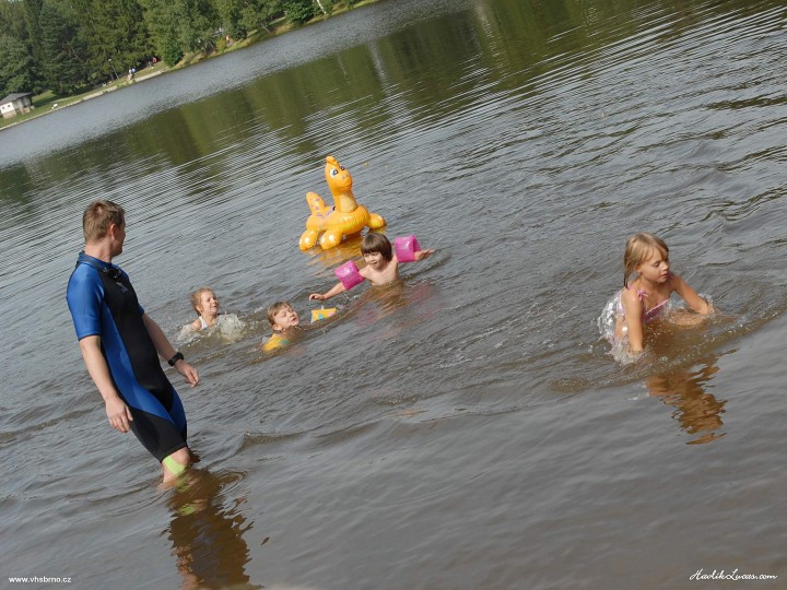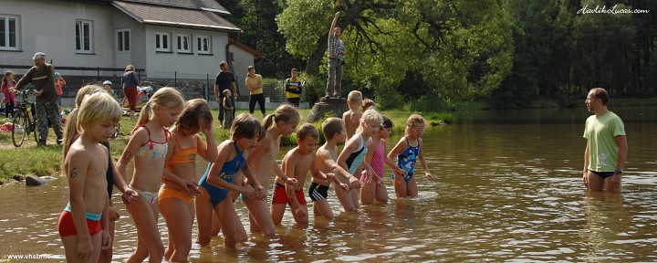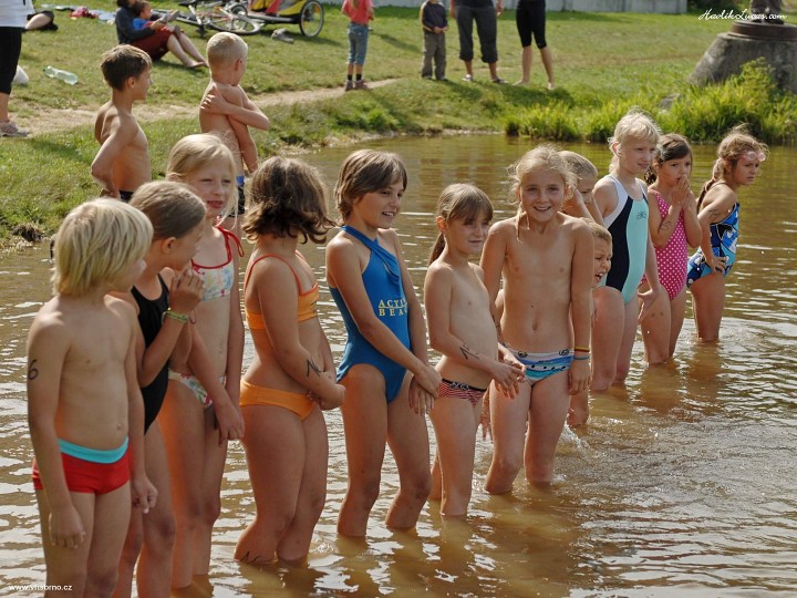 Velkou novinkou bylo vypsání závodu dětí (2 kategorie). Celkem se přihlásilo 14 dětí, které absolvovaly 20/40m plavání či chůze po dně, 2 kola kolmo kolem rybníka a nakonec závěrečný běh kolem rybníka. Zde musím podotknout, že se projevilo velké nadšení malých závodníků o konečné vavříny, tak i úžasné přátelské povzbuzování a smysl pro fair play a pomoc při karambolu.