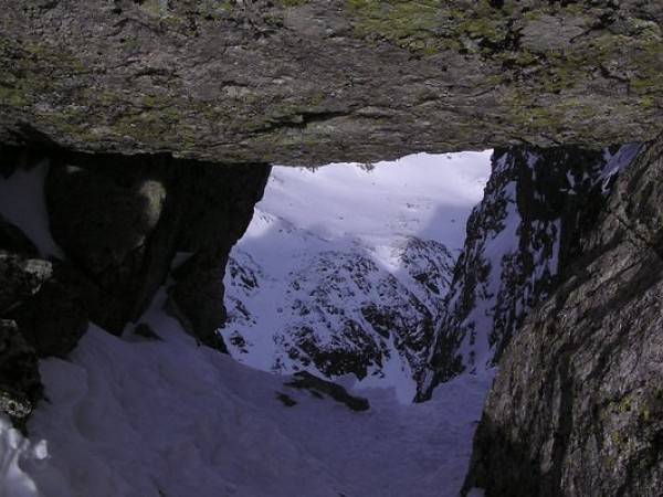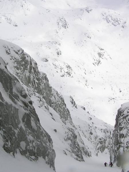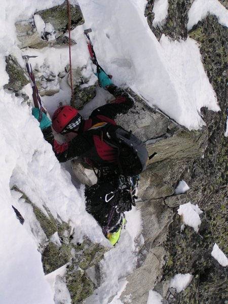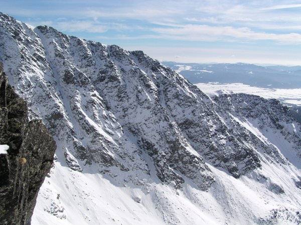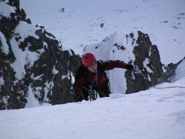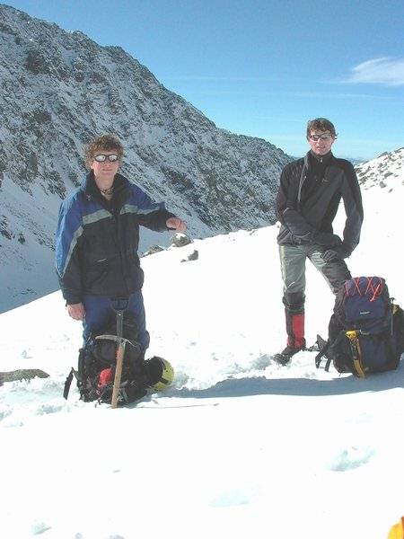 Po příjezdu všech účastníků jsme valili hned na svah pod sedlo Ostrvy, kde jsme začali nacvičovat brždění a jistící techniku na sněhovém svahu. Sníh byl slehlý a ne moc mokrý. A tak se jezdilo ostošest. Na těchto hrátkách se některým účastníkům horoškoly ukázalo, jak špatně jsou vybaveni. Otlačené nohy, neseřízené mačky, neznalost uzlování a jiné problémy. Večer bylo tudíž hodně práce vše nachystat na úspěšný první výstup. Rozdělení do skupin, pár panáků na noc a hajdy na kutě.