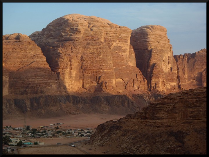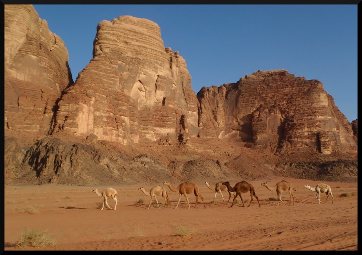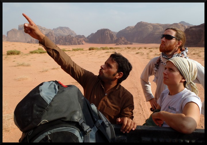 Všude se na nás z billboardů usmívá král Abdalláh II, údajně přímý potomek proroka Mohameda. Hášimovská dynastie vládne v Jordnánsku od roku 1921 a královská rodina je zde velmi oblíbena. Na hranicích už na nás čeká taxík vyslaný Mohammedem, takže cca po 2 hodinách se dostáváme do Visitors centra u vstupu do Wadi Rum protected area. Tam jim musím sepsat nějaké anglické prohlášení, že polezeme na vlastní zodpovědnost a že správa parku za nic neodpovídá, kdyby se nám něco stalo. U Mohammeda budeme jen bydlet, ale ten také za nic neodpovídá..