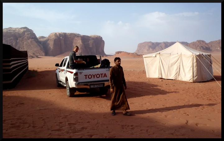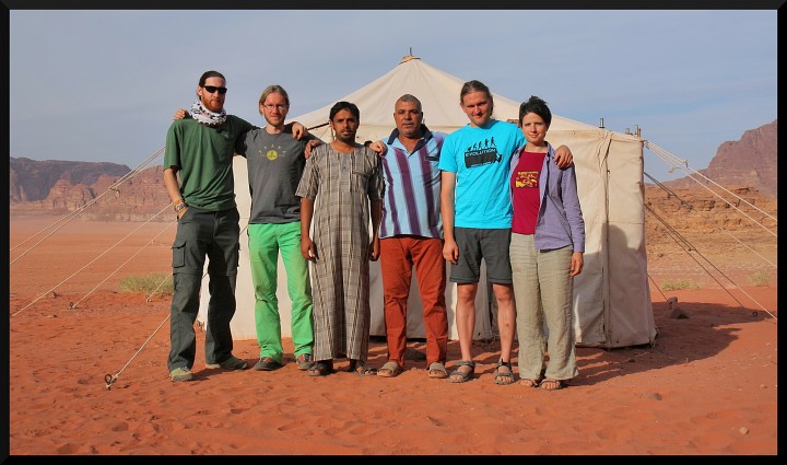 Mohammed Hammad je sympatický týpek (kontakt na něj jsem našel na stránkách legendárního francouzského lezce Arnauda Petita a domluva proběhla celkem bez problémů přes facebook). Sám je dobrý lezec, i když by to člověk na první pohled neřekl, chodí v tradičním beduínském hábitu. Našel jsem o něm článek i ve starém Climbu. Jeho rodina žije v Rumu stovky let a po jeho otci je dokonce pojmenována cesta na Jebel Rum – Hammads route. Výhoda je, že s ním můžeme zkonzultovat naše lezecké plány. Domluva je jasná – ráno nás odveze pod stěnu svou terénní Toyotou 4x4 a večer pro nás přijede. Doporučí nám hezké cesty, které budou ve stínu. V Rumu je kolem 30 °C, což na lezení není ideální, ale ve stínu se lézt dá. V kempu budeme mít snídaně a večeře. K obědu nám vždy nakoupí nějaké jídlo s sebou. Čeká nás 7 dnů lezení v největších pískovcových stěnách světa. Nemůžeme se dočkat druhého dne. Dobrodružství může začít.