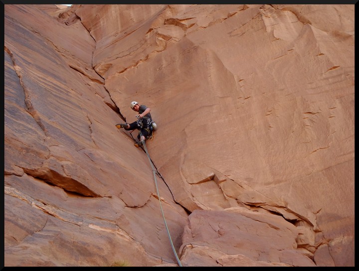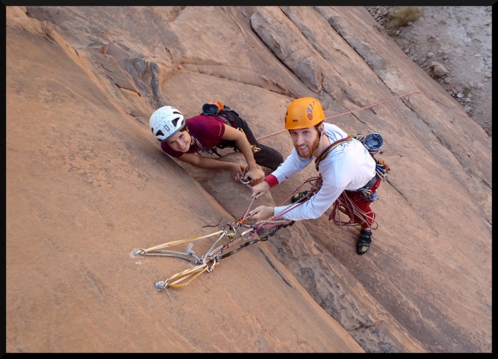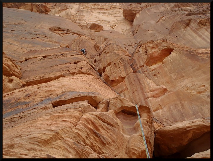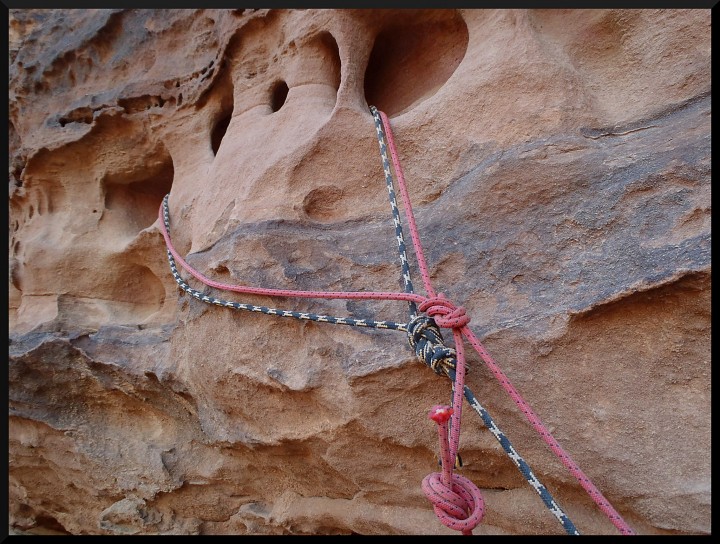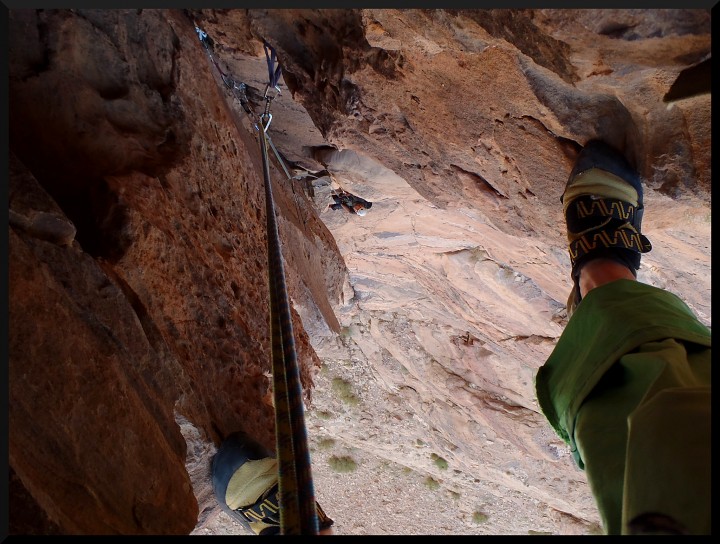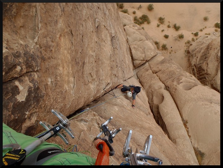 . Je to tedy úplně jiný pocit než u nás na písku. Výhodou je, že v cestách jsou opravdu dobré spáry na friendy, což dodává jistotu. Merlin´s wand po dolezení proslaňujeme dolů a večer čekáme s Mohammedem na Jirku a Elišku, kteří v jedné z cest (Purple Haze) trochu zabloudili. Nakonec dolézají nahoru a slaňují za tmy na polici, kde už na ně čekáme.