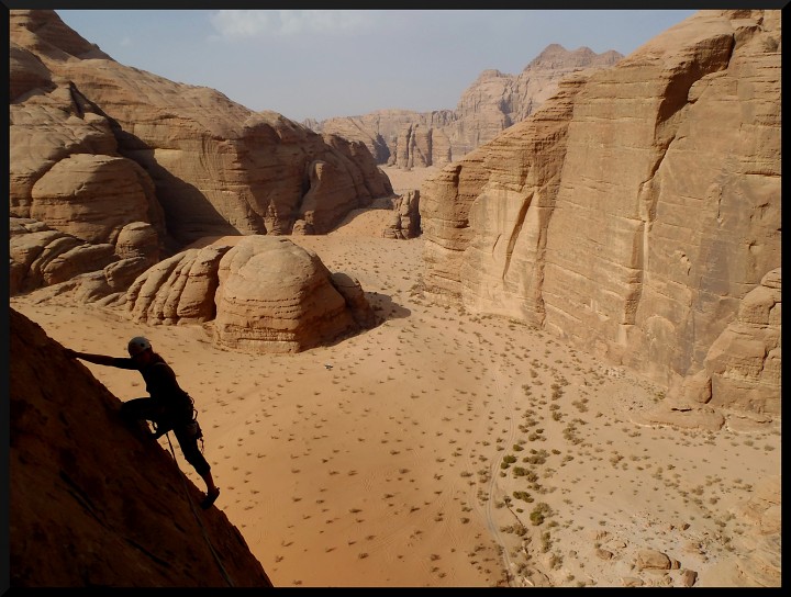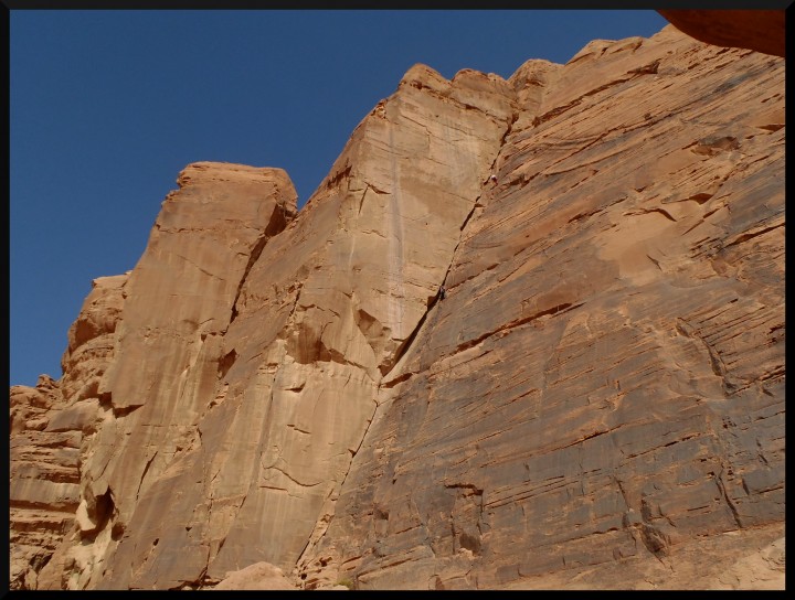 Merlin´s Wand – legendární Supercrack of Rum, 6a+, TD, parádní 5 délková spára jak podle pravítka. Cesta se nachází v Barrah Canyonu asi 10 km od kempu. V cestě jsou štandy z nýtu a skob a do spáry jde krásně pozakládat. Průvodce dále uvádí, že v cestě zažijeme „surprising situations“. Nevíme moc, co si pod tím představit, ale lezení je to opravdu parádní. Někde se leze spára na žábu, někde na pěst, místy jsou i chyty a stupy kolem spáry, které se dají využít. V cestě jsou 2 převisy. Lezeme na jistotu, přece jen jsme asi 100 km od nejbližší nemocnice a v případě zranění nelze spoléhat na nějakou záchranu. Tony Howard uvádí v průvodci, že záchrana je omezena na dobrovolné skupiny beduínů..