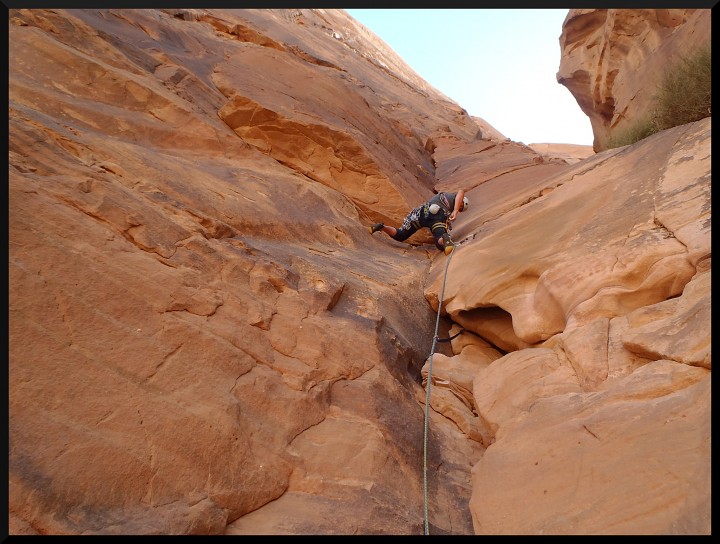 Další den ráno je zase krásně, takže jedeme s Mohammedem pod Um Ejil. Nástup pod The Beauty je trochu delší – cca 1,5 hodiny bludištěm kaňonů. Mohammed nám podrobně popisuje cestu. Eliška s Jirkou mají v plánu L'Aperitif na Um Ishrin. Několika fantastickými kaňony se dostáváme pod Um Ejil a nastupujeme do The Beauty TD, 6b, první délka je nádherná spára, která se leze na sokola. V cestě jsou osazené štandy. Další délka je ádrovský kout, který se proměňuje opět v dlouhou spáru až na vrchol věže. Pokračujeme direkt variantou za 6b a dolézáme na polici. Před námi je širočina jak na Rakev, mírně na sokola. Zkouším do ní několikrát nalézt, ale nemáme velké friendy a lézt 20 metrů bez jištění tady uprostřed pouště si netroufám. Poslední délku tedy necháváme na příště a slaňujeme zpět linií cesty k věcem. Dole se setkáváme s Jirkou a Eliškou, kteří mezitím vylezli L'Aperitif a sestupujeme do vesnice druhým kaňonem na sever.