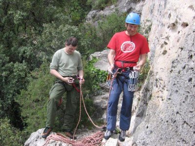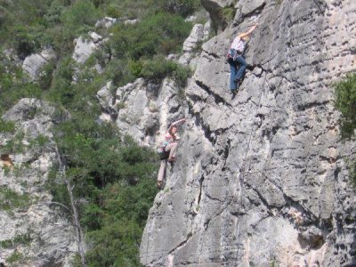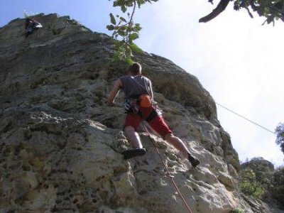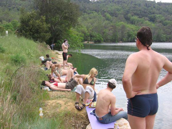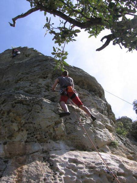 ...vápenec pevný, zajištění prvotřídní řetízky na slaňování, očištěné od volných kamenů, výběr cest co do obtížnosti a délky, prostě dobrý jak chceš. Odpolední slunce nás vyhání k řece. Svačíme ve stínu, když slyšíme známé hlasy. Přijíždí Mazda s osádkou Andy, Komiš, Mauglí a Zuzanka (hmmm)...Na přehradu