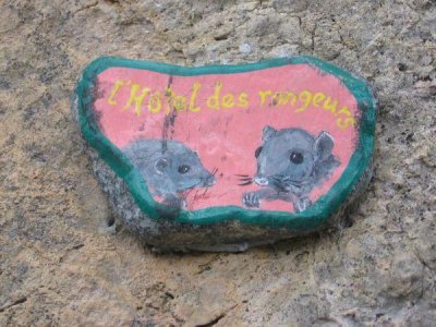 ...vítá nás baldachýn hustého porostu pod nímž procházíme ke skalám. Nalepené valouny s naivními kresbičkami určují nástupy cest. Standardní kvalita - očištěná skála, borháky, řetízky, minimálně ojeté, dvoudélkové cesty. Výkony se posouvají. Mládež i starci stoupají jako kuny. Už jen zakousnout krysu koukající z díry v cestě Myší hotel...Náraz 4