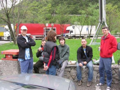 ...posílám SMS vozu 2, který je už dávno v Itálii a požadujeme navigační SMS. Libor posílá itinerář. Zastavujeme na snídani. Bohužel nárazem do zítky na parkovišti. Týpek to auto fakt nešetří. Na oslavu pokračující cesty sežereme Týpkovi vynikající buchtu od maminky. Přestalo pršet a vítá nás úrodná rovina slunné Itálie...EU dle SMS(část první)