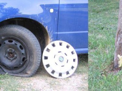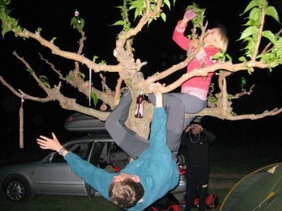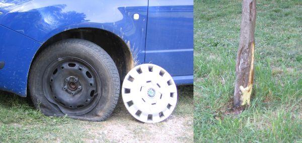 ...konečně ráno vyrážíme do skal. Couváme v kempu. Pozor říká Bára (kempař na kole se plete za couvajícím vozem). Jáá ho vidím ! - komentuje s přehledem profesionálního řidiče Týpek a pokračuje v elegantním couvání. Pozor! Křiknu já na sedadle spolujezdce, ale to již otáčející se čumák vozu levou stranou nemilosrdně rozdírá kůru stromu v kempu. Dle sotva zacelených ran konstatujeme - nebyli jsme první. Jak se později ukázalo ani poslední...První doteky